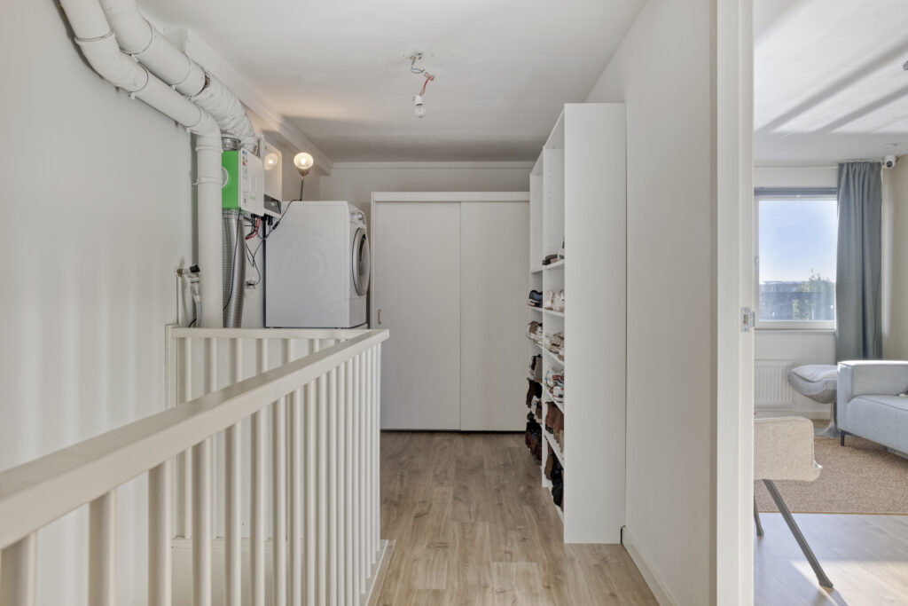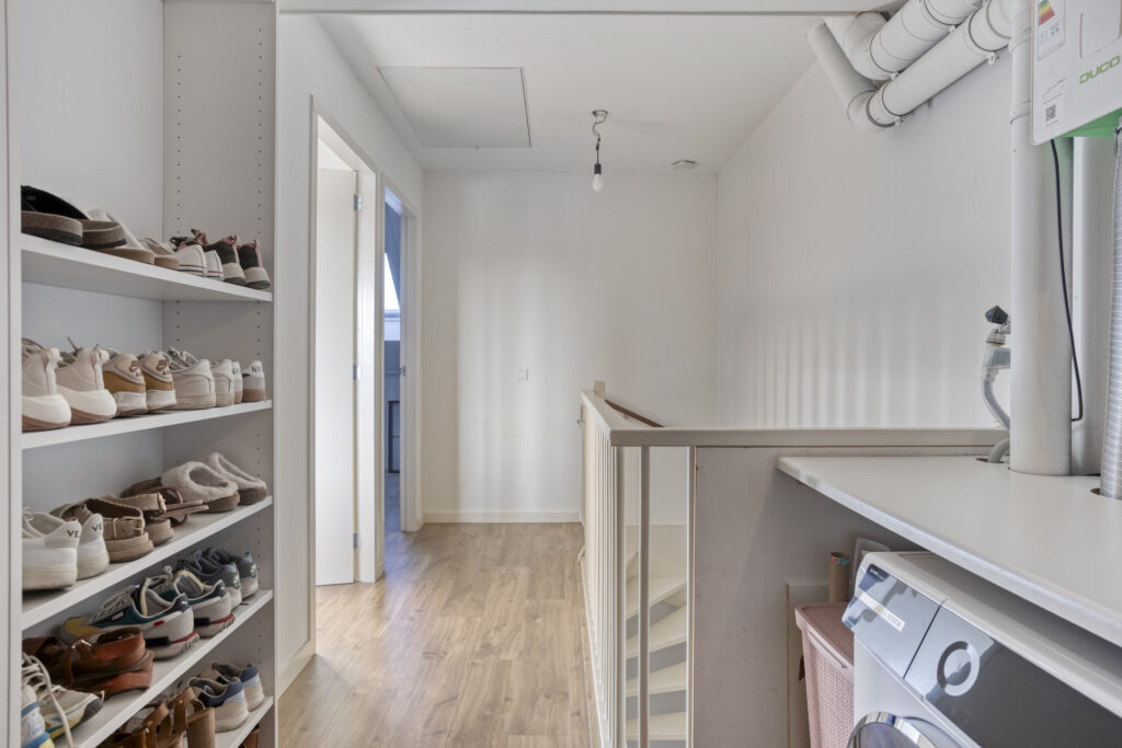 Overloop met aansluitingsmogelijkheden ten behoeve van wasapparatuur, mechanische ventilatie unit (2025) en luik met vlizotrap naar ruime bergzolder;