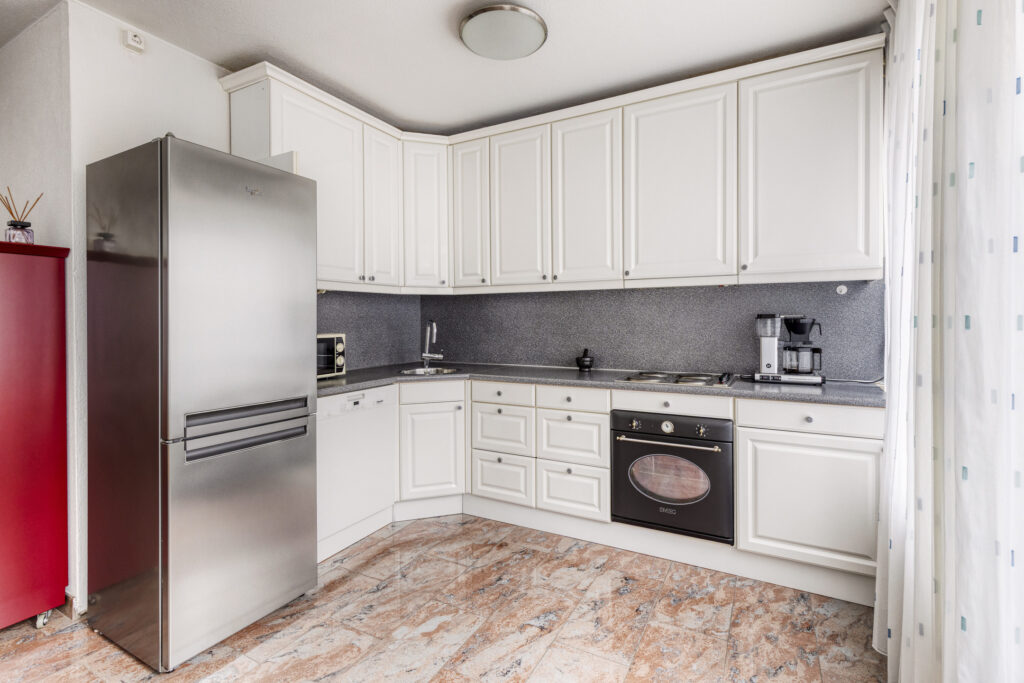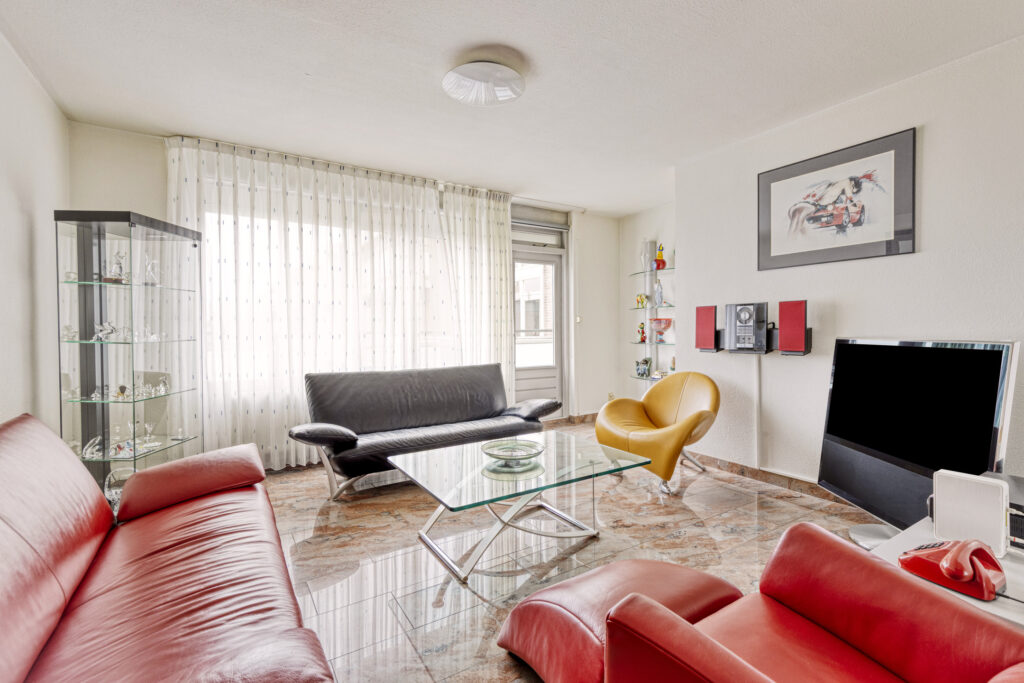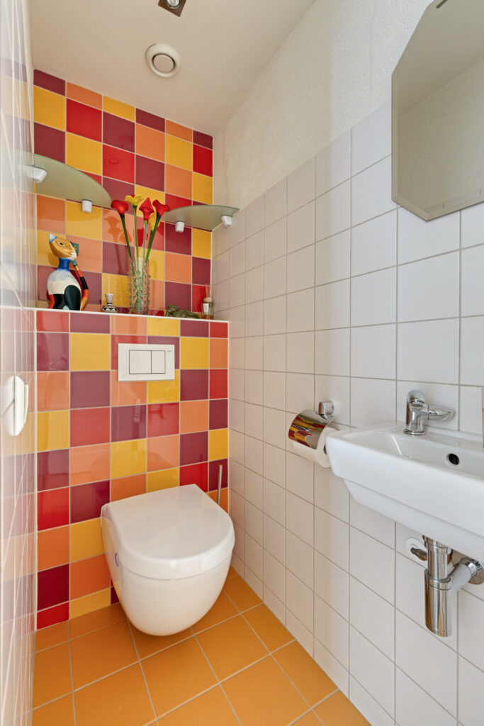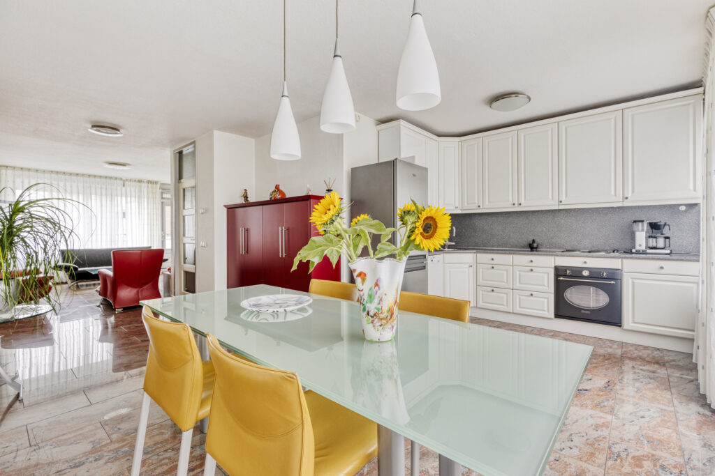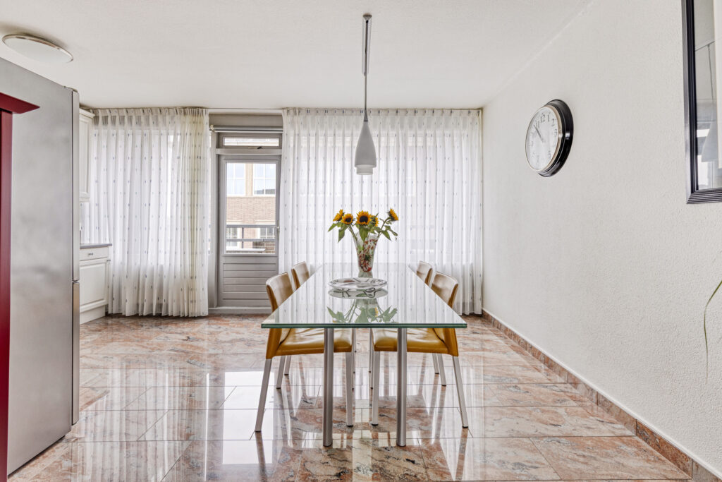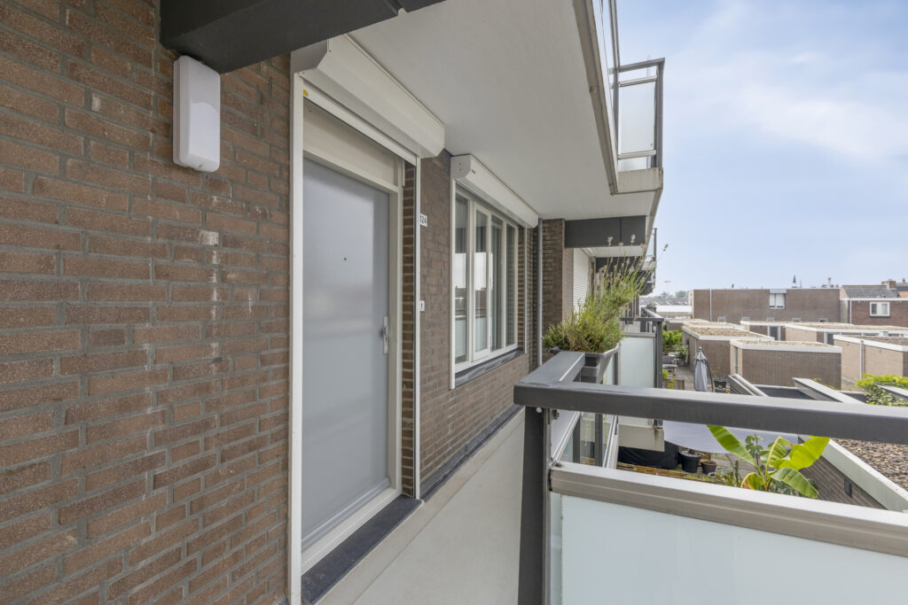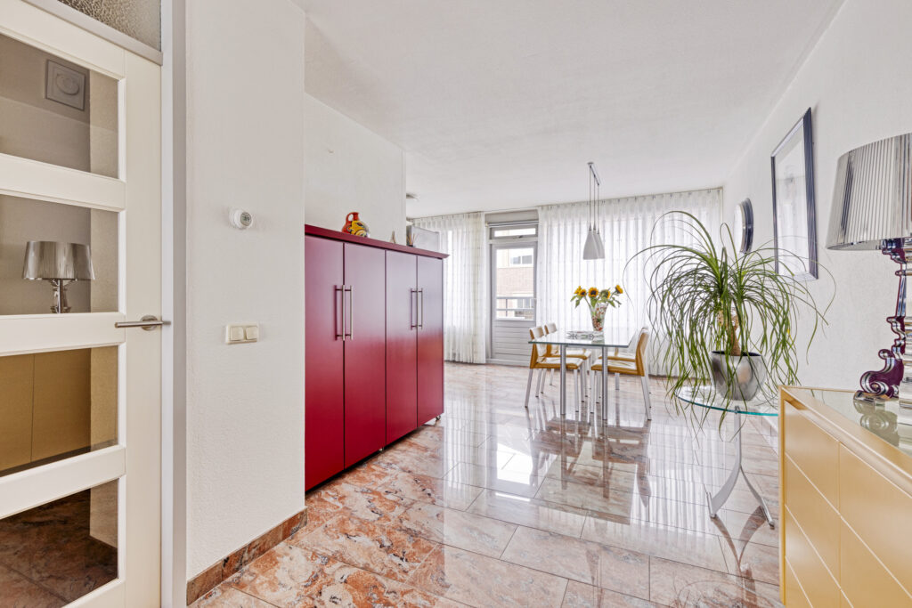Overloop, met toegang naar de woonkamer, het toilet en berg-/stookruimte (CV-ketel Remeha 2020). Het toilet is volledig betegeld en uitgevoerd met een hangcloset, fonteintje en mechanische ventilatie. Woonkamer, met Italiaanse tegelvloer met toegang naar de open keuken en het balkon aan de voor- en achterzijde van het appartement. De open keuken in hoekopstelling is uitgevoerd met diverse boven- en onderkasten en inbouwapparatuur te weten: elektrische kookplaat, afzuigkap, hetelucht oven (SMEG) en vaatwasser (los). Vanuit de keuken is het balkon op het oosten bereikbaar met waterpunt.