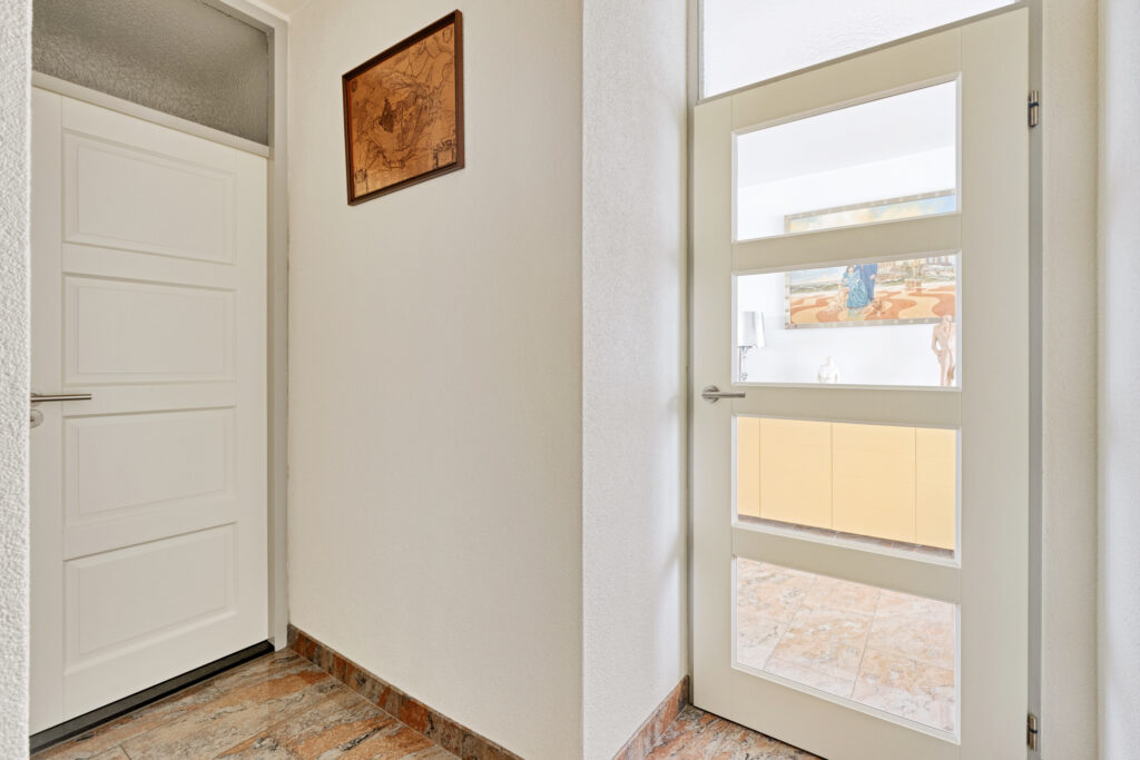 Entree/hal, met intercom, meterkast toegang tot de slaapkamer, vaste trap naar de tweede woonlaag en een bergkast. Slaapkamer afgewerkt met een laminaatvloer en doorgang naar de badkamer. De badkamer is volledig betegeld en voorzien van: Whirpool ligbad, wastafel in meubel, handoekenradiator en aansluitingen ten behoeve van de wasapparatuur.