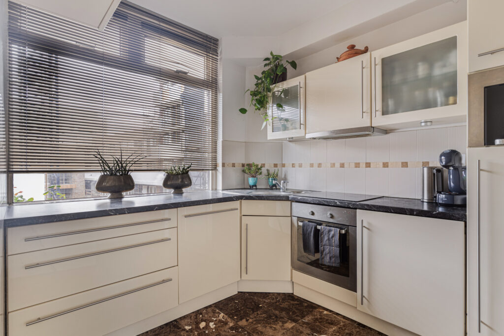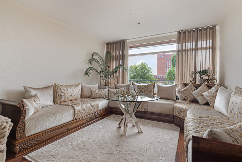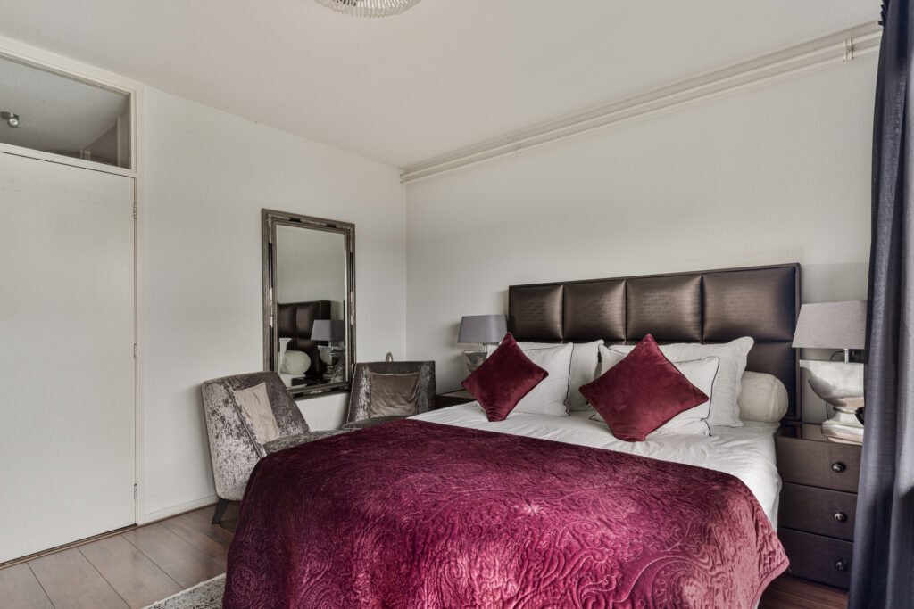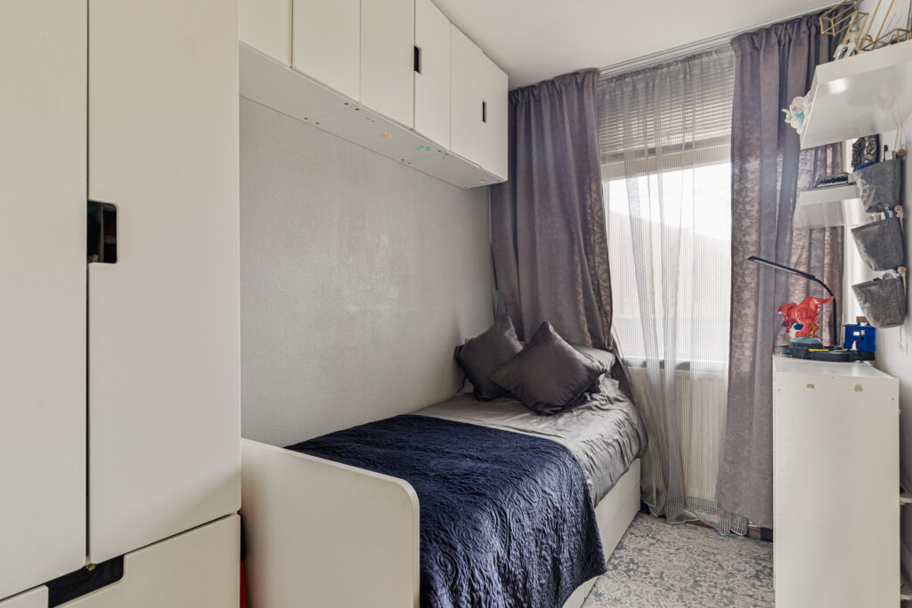 Entree/hal met intercom/videofoon, toegang tot de keuken, woonkamer en overige vertrekken. Ruime keuken aan de galerijzijde (circa 2.42 x 3.34 m) met een keukenblok in hoekopstelling met diverse boven- en onderkasten. Aan inbouwapparatuur is aanwezig: keramische kookplaat, afzuigkap, oven en magnetron. In een keukenkastje is de CV-combiketel verwerkt, verder is er een praktische voorraadkast. De woonkamer is gelegen aan de voorzijde van het complex en voorzien van een laminaat vloer en deur naar het zonnige balkon. Vanuit de hal is er toegang tot de 2 vaste inbouwkasten, de twee slaapkamers aan de galerijzijde ( 2x circa 1.94 x 2.85 m), de toilet, de ruime bergkast, de badkamer en de derde slaapkamer/master bedroom. De moderne badkamer (circa 1.89 x 2.01 m) is geheel betegeld en heeft een Whirpool ligbad met douche en een wastafelmeubel met spiegel. De toiletruimte is half betegeld en voorzien van een staand toilet en fonteintje. De master bedroom (circa 3.65 x 3.65 m) is gelegen aan de voorzijde en biedt toegang tot het balkon.