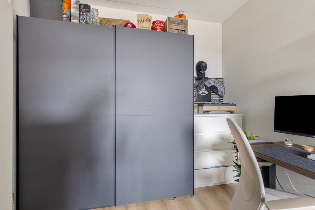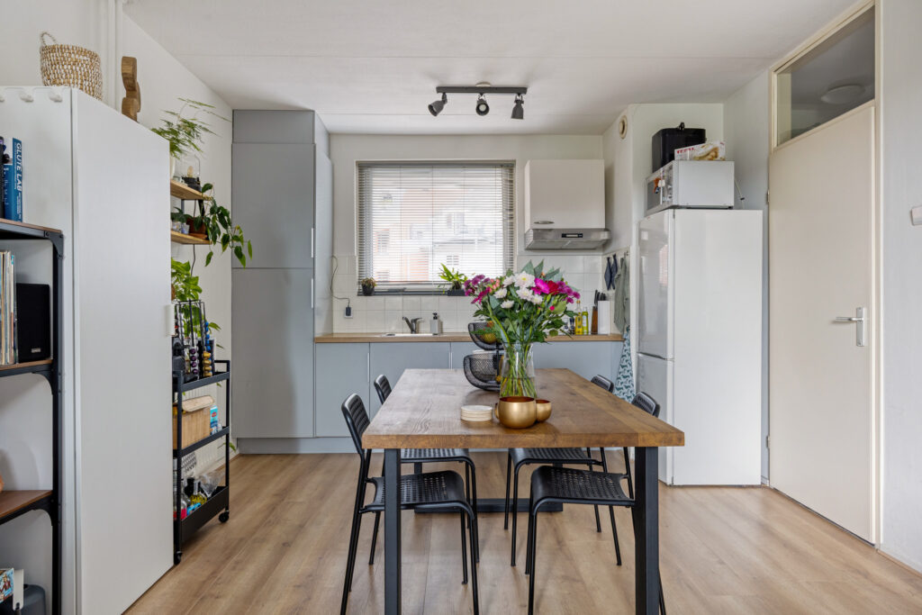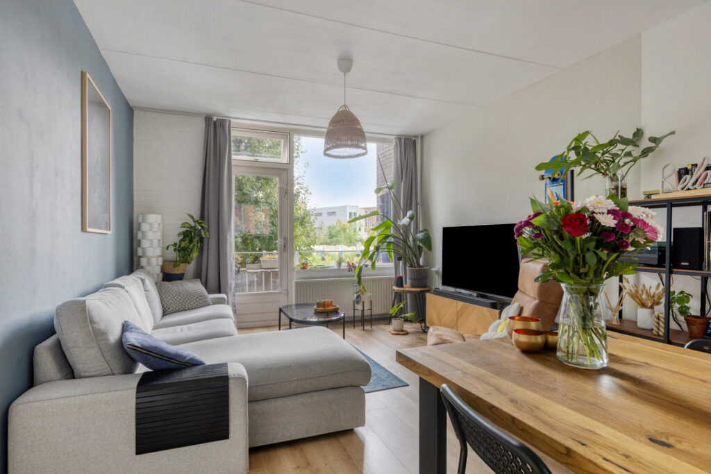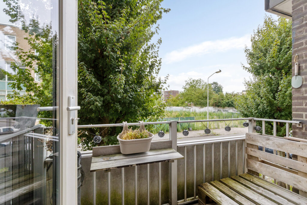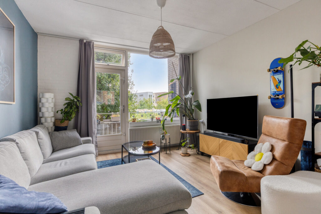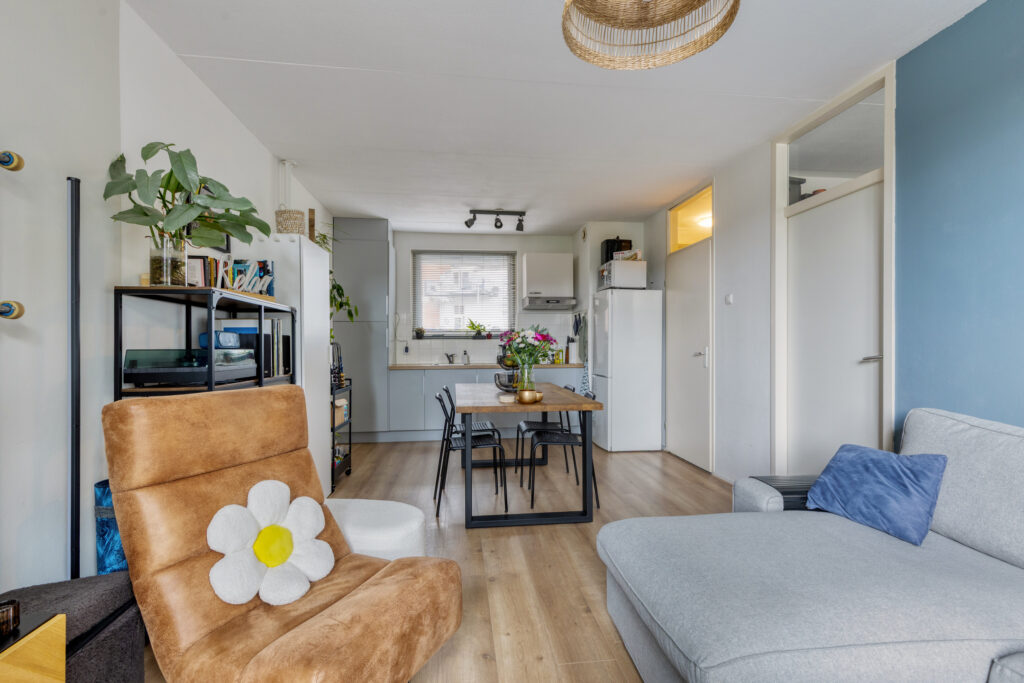Entree, hal met video-intercom met toegang tot volledige betegelde badkamer, voorzien van een douche, hangcloset en ruime wastafel, tevens treft men hier de aansluiting ten behoeve van de wasapparatuur. Ruime woonkamer (ca. 7.00 x 3.58m.) met toegang tot het balkon op het zonnige zuiden (ca. 2.72 x 1.41m). De open keuken is gelegen aan de galerijzijde en voorzien van een moderne inrichting in wandopstelling met diverse kastruimte, aan inbouwapparatuur is aanwezig een elektrische kookplaat, een koelkast (los) en een afzuigkap. Vanuit de woonkamer is de ruime slaapkamer te bereiken (ca. 4.64 x 2.66m.).