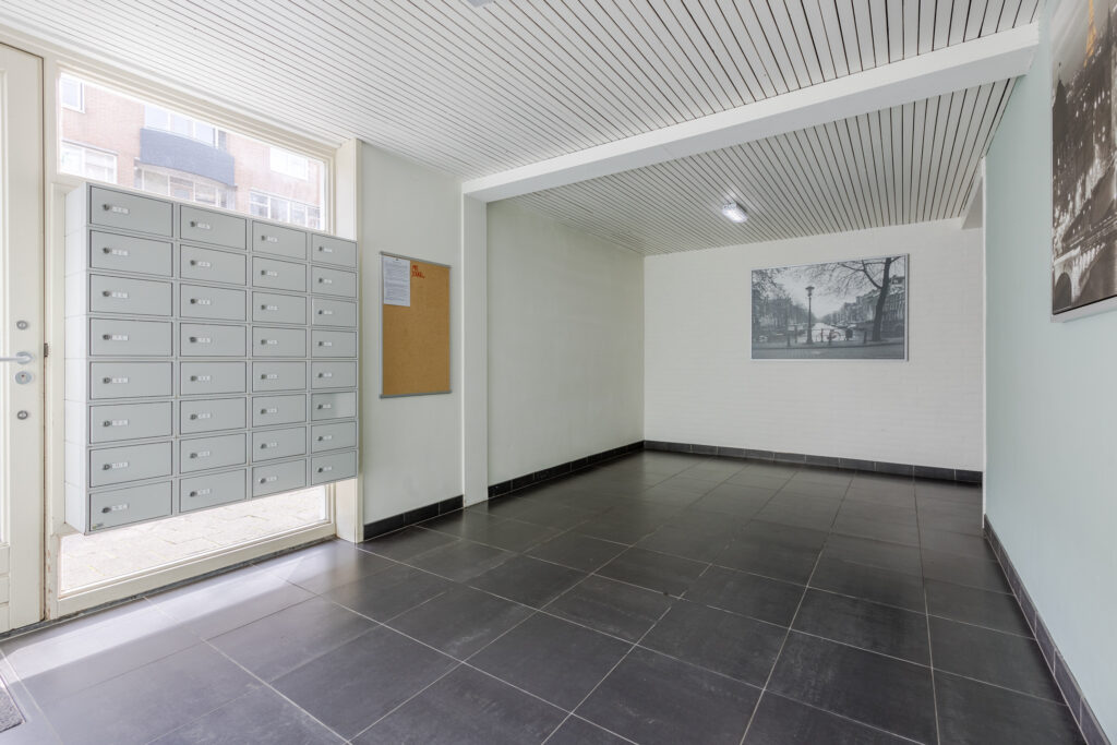 Centrale afgesloten hal/entree met brievenbussen, toegang tot de bergingen, de parkeerplaatsen, het trappenhuis en de lift. Tevens de eigen afsluitbare berging met elektra.