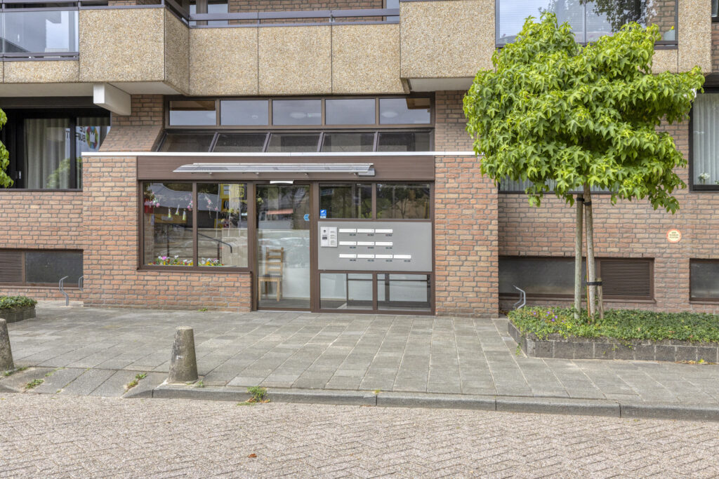 Vanaf de centrale voordeur met bellentableau bereikt u de portiek die toegang geeft tot het trappenhuis en de lift. Tevens is er een rolstoellift aanwezig. Het appartement is gelegen op de vierde verdieping.