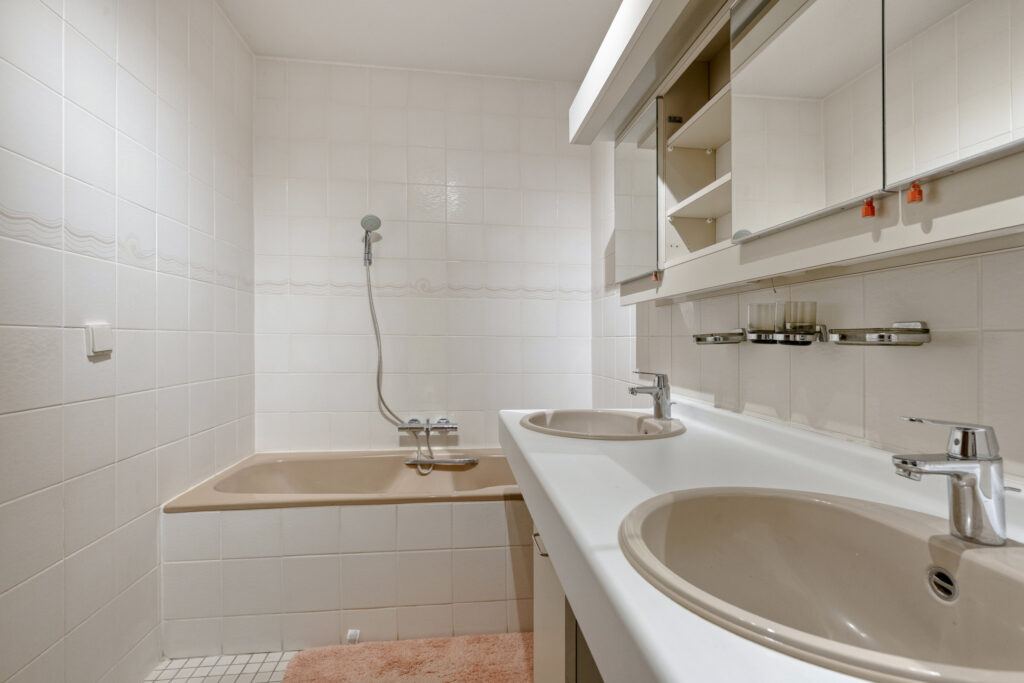 * Grote badkamer met ligbad, dubbele wastafel met meubel en een staand closet.