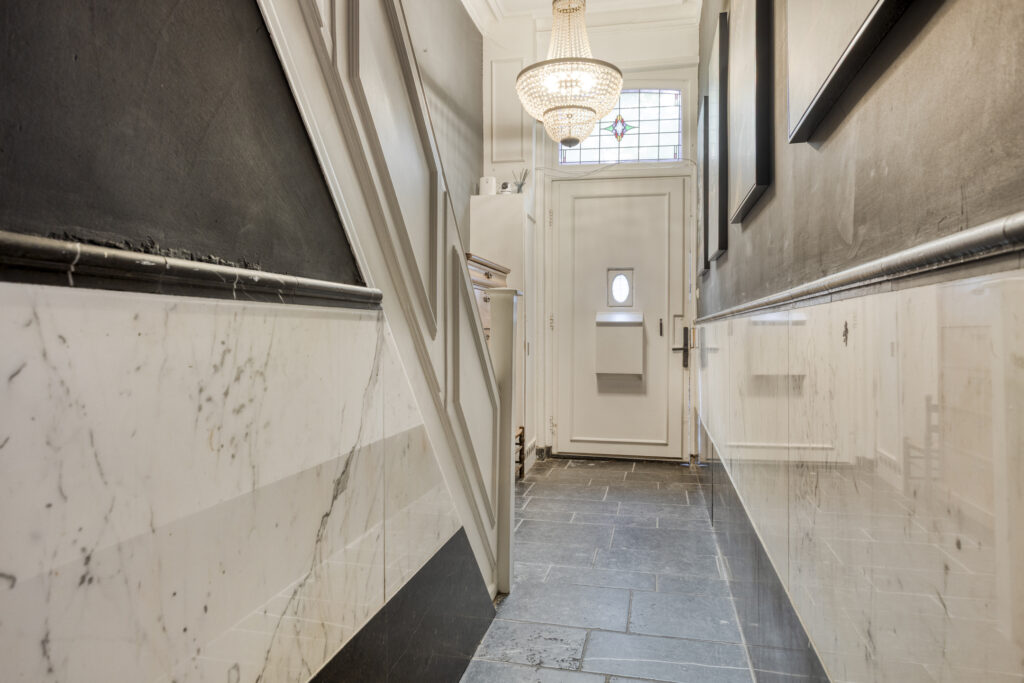 Imposante hal-/entree voorzien van hardstenen tegelvloer, marmeren wandpanelen, meterkast, vaste trap naar de eerste verdieping en loopdeur naar de living. Ruime toilet met zwevend closet en fonteintje.