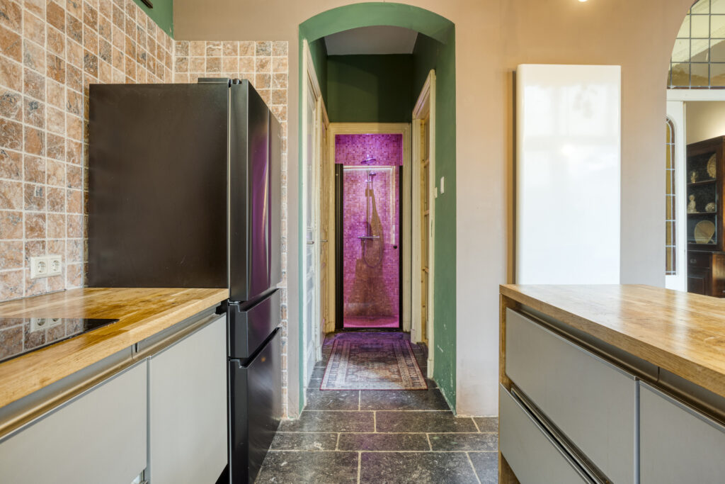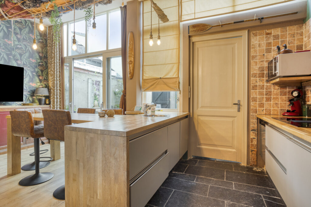 Sfeervolle en ruime living met schouw, hoge plafonds met sierlijsten, glas-in-lood bovenlichten en dubbele en-suite deuren naar woonkeuken. De living is ruim van opzet en biedt ruimte voor een gezellig zithoek bij de schouw met een fraai vrij uitzicht over de oude singel aan de voorzijde van de woning. Op de vloer van de living en het zitgedeelte van de keuken ligt laminaat en de wanden zijn deels voorzien van lambrisering deels stucwerk. Riante woonkeuken gelegen aan de achterzijde van de woning. Vanuit de woonkeuken heeft u middels openslaande deuren toegang tot de achtertuin. Keuken voorzien van een hardstenen blad, spoelbak, losse koelkast met vrieslades, oven, vaatwasser, 4-pits inductiekookplaat met inbouwde afzuiging. Vanuit de keuken heeft u toegang tot de kelder (ca. 3.00m x 3.00m) op stahoogte (1.80m), vaste kast met veel opbergruimte en de opstelplaats voor de CV-installatie, tevens is hier een douchruimte aanwezig. Aan de tuinzijde van de keuken is er toegang tot de ruime slaapkamer. Vanuit de slaapkamer heeft u middels een schuifpui tevens toegang tot de achtertuin. Vanuit de slaapkamer bereikt u de riante inpandige garage.