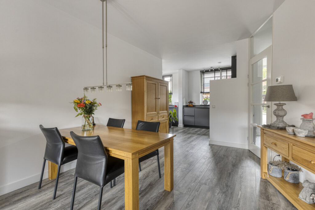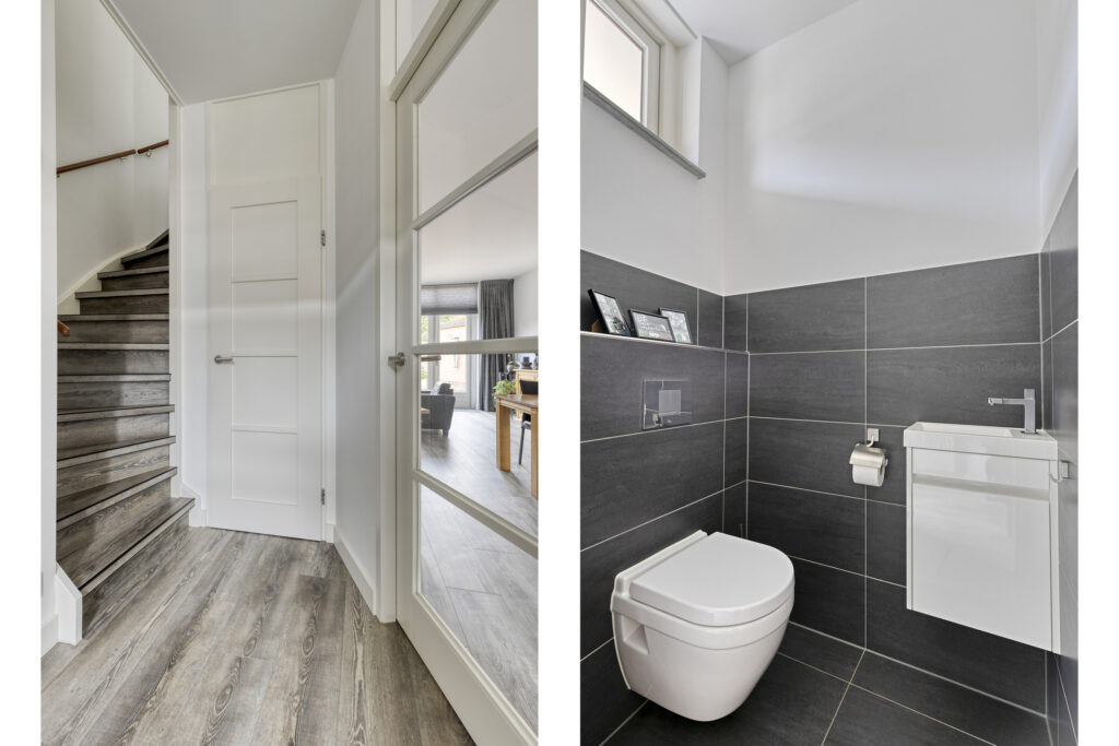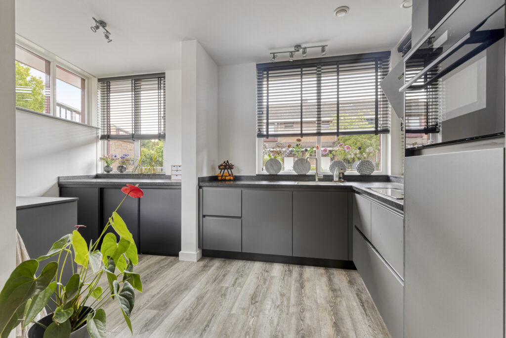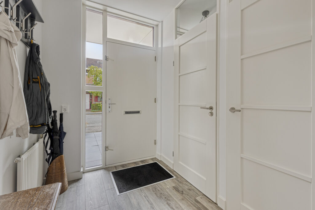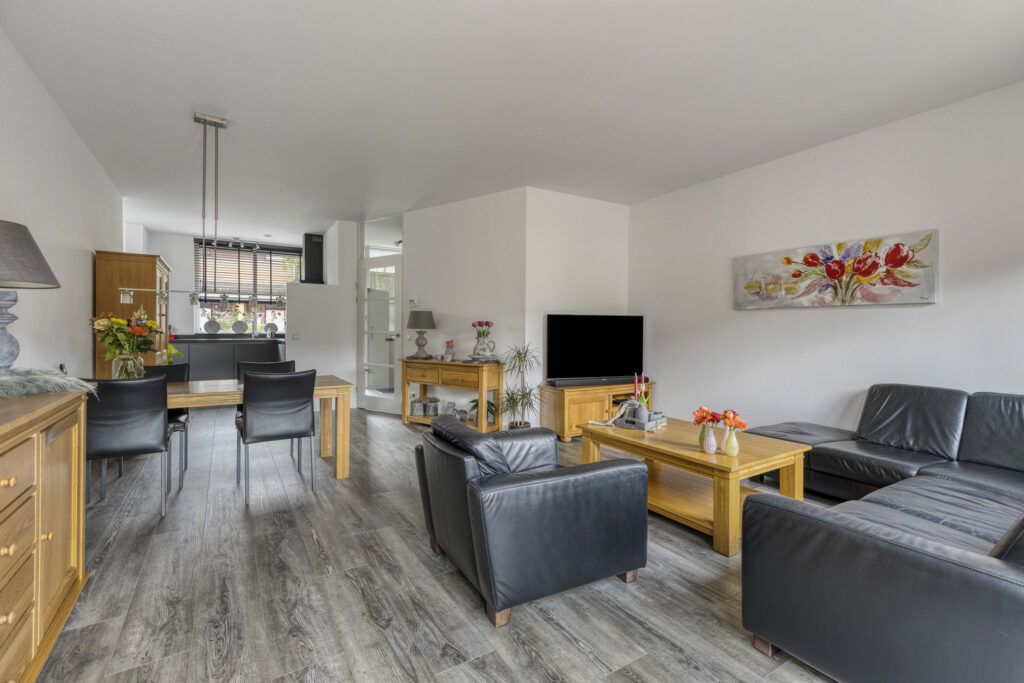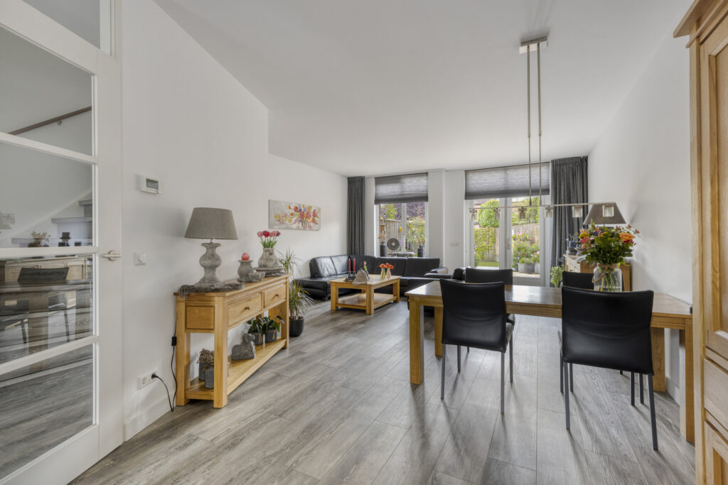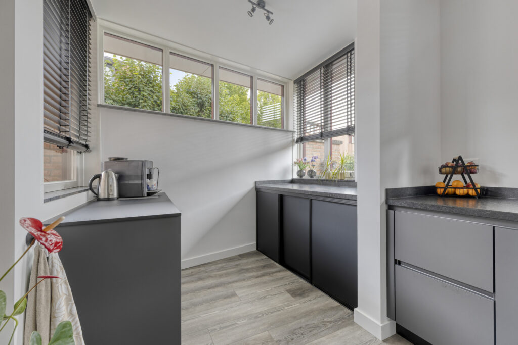Entree met toegang tot de moderne meterkast, de ruime berg(trap)kast en toiletruimte voorzien van een hangcloset en een fonteintje in meubel. De ruime woonkamer heeft veel lichtinval en biedt toegang tot de tuin middels openslaande deuren. De halfopen, luxe keuken (bj. 2024) is gelegen aan de voorzijde en uitgevoerd met een hoogwaardige, antraciet keukeninrichting in hoekopstelling met natuurstenen aanrechtblad en diverse boven- en onderkasten. Aan inbouwapparatuur is aanwezig: inductie kookplaat, afzuigkap, vaatwasser, combi oven-magnetron en koelkast. In het verlengde van de keuken is er een extra keukenblad met aansluitingen wasapparatuur (weggewerkt d.m.v. schuifdeuren) en is er plaats voor eventueel een vriezer. Aan de andere zijde is nog één extra keukenblad geplaatst met extra kastruimte.