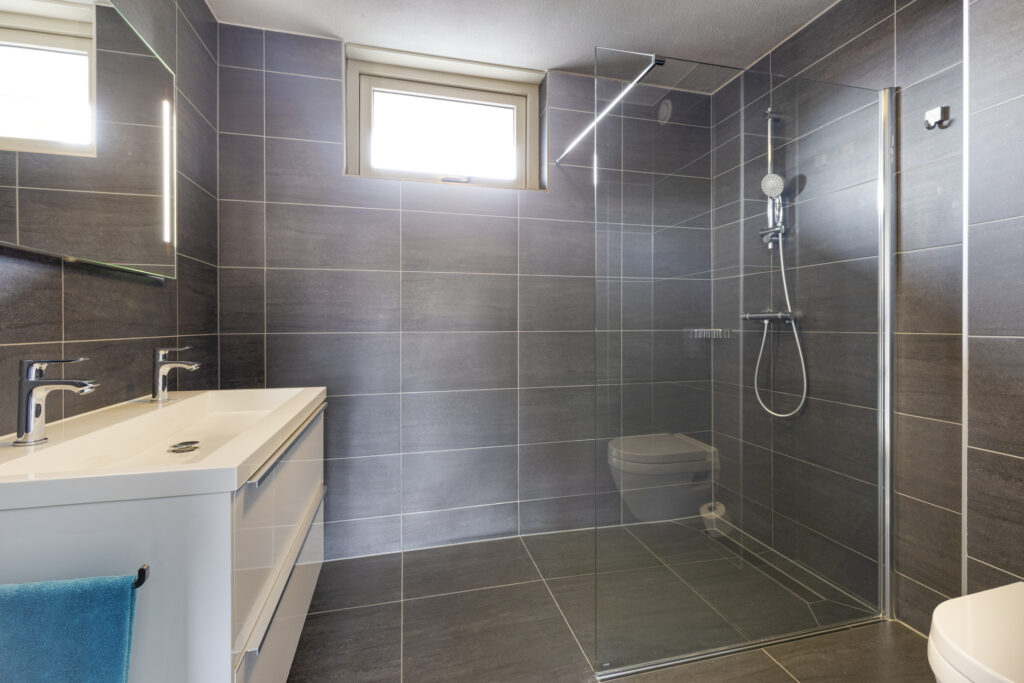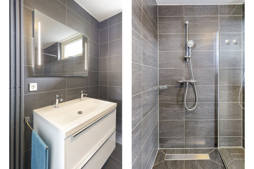 – Geheel betegelde, moderne badkamer voorzien van; inloopdouche met glazen spatscherm, wandcloset, wastafel in meubel, spiegel met verlichting en handdoekenradiator.