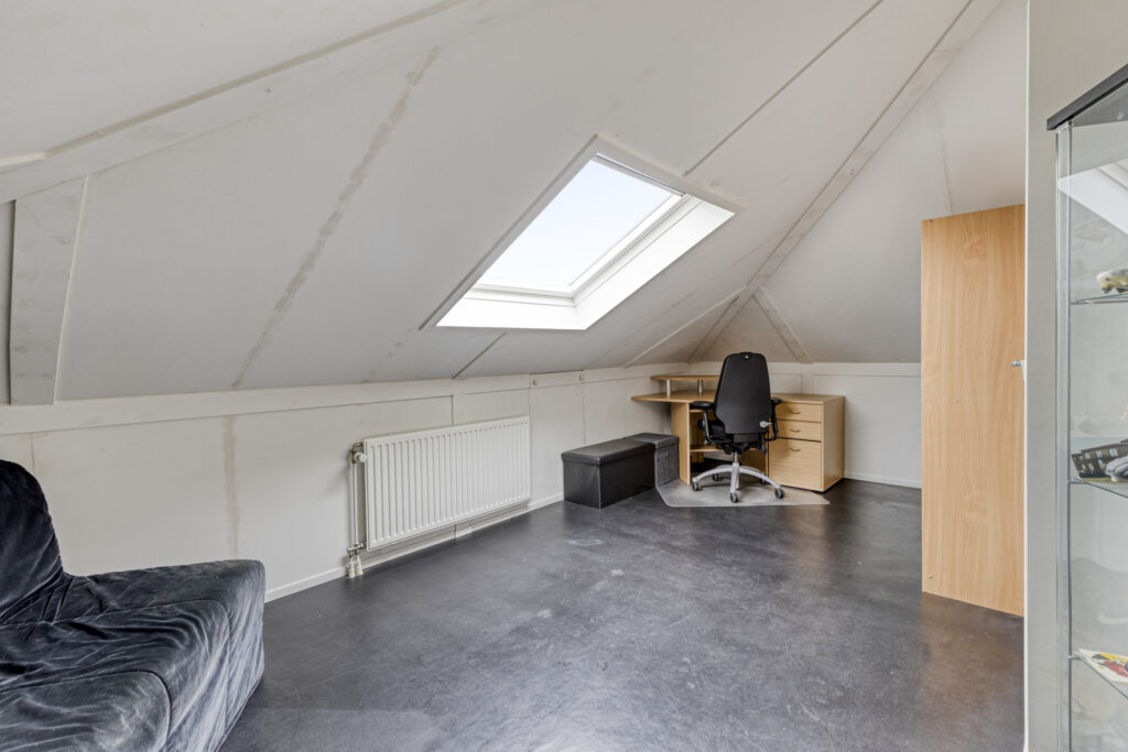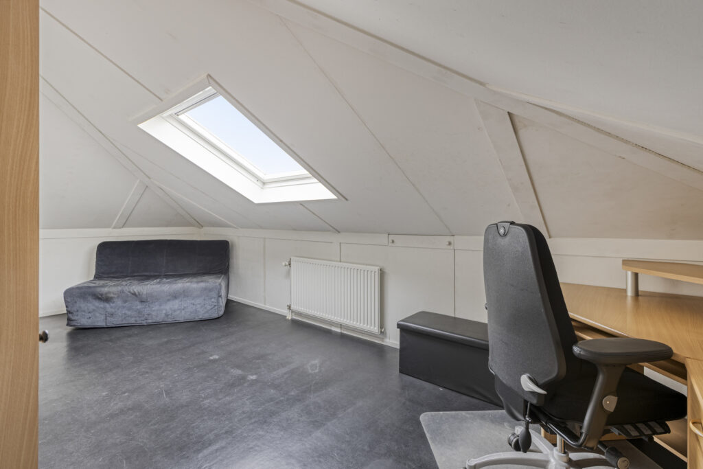 -Slaapkamer 4; ruime zolderkamer met airconditioning en Velux dakraam. Verder is er extreem veel bergruimte achter de schuine kanten (langs 3-zijden). In een vaste kast zit de CV-combiketel verwerkt (Remeha 2009).