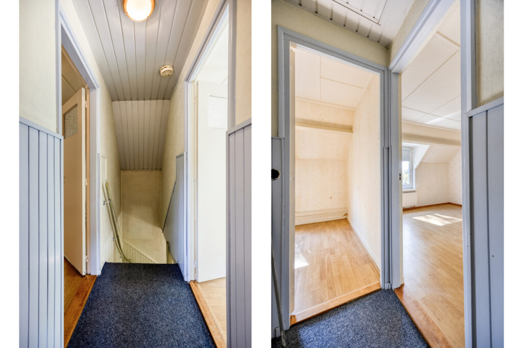 De overloop biedt toegang tot de 4 slaapkamers en de badkamer. Via een vlizotrap is de bergzolder te bereiken.