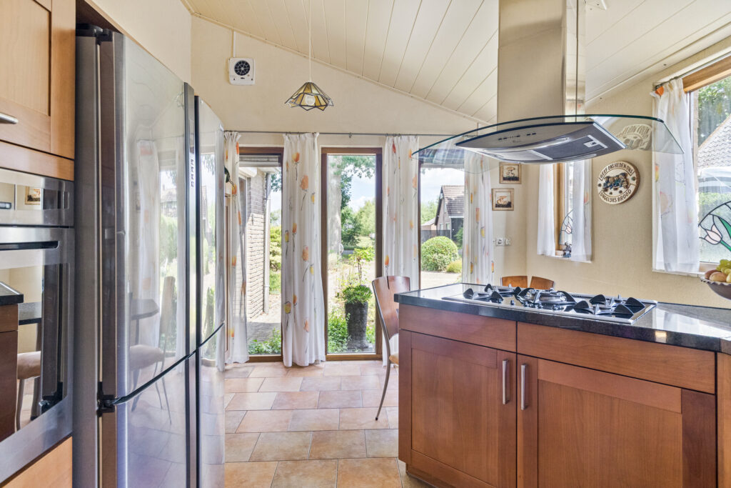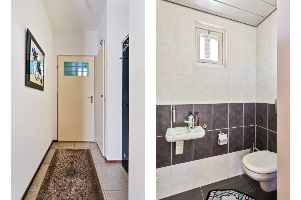 Entree/hal met vide, afgewerkt met een tegelvoer en schoonmetselwerk wanden en geeft toegang tot de woonkamer, de meterkast, het toilet, de garderobenis en de trapopgang naar de verdieping. De volledig betegelde toiletruimte is voorzien van en hangcloset en een fonteintje. De royale woonkamer voorzien van vloerverwarming en gashaard is ruim 40 m² groot, heeft veel lichtinval en biedt mooi uitzicht over de tuin en het groen. Middels een schuifpui is het terras te bereiken. De eetkeuken is voorzien van een keukeninrichting in U-opstelling met bar en diverse boven- en onderkasten. Aan inbouwapparatuur is aanwezig een oven, een koel-vries combinatie, een vaatwasser, een zwevende afzuigkap en een 5-pits gaskookplaat. Vanuit de keuken is er toegang tot de bijkeuken met aansluitingen wasapparatuur, kastruimte en loopdeur naar de tuin. De slaapkamer op de begane grond is toegankelijk vanuit de woonkamer en afgewerkt met een tegelvloer met vloerverwarming. Middels een schuifpui is er toegang tot de tuin. De badkamer en-suite is voorzien van een verzonken zitbad met douche, bidet, toilet en een badkamermeubel met spiegel.