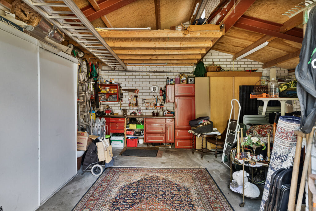 Royale garage met dubbele muur van ruim 35 m². De garage is voorzien van 2x openslaande garagedeuren, betonvloer, bergvliering en een werkbank met ruime opbergkasten.