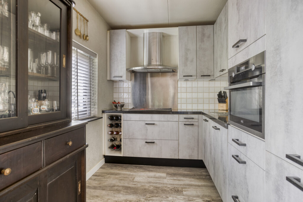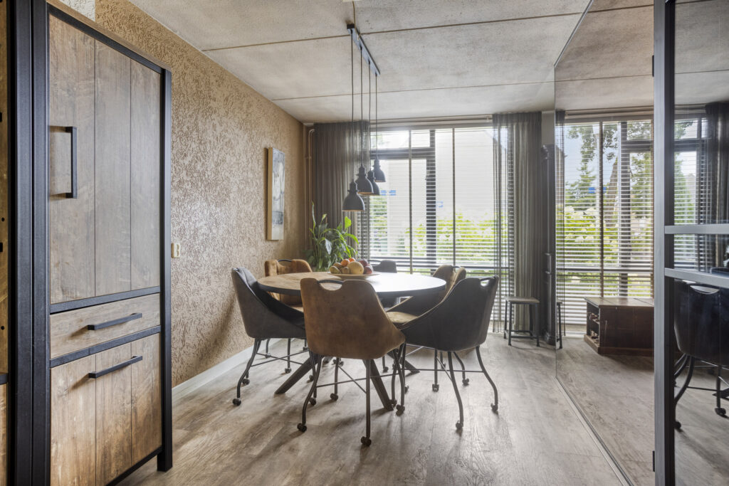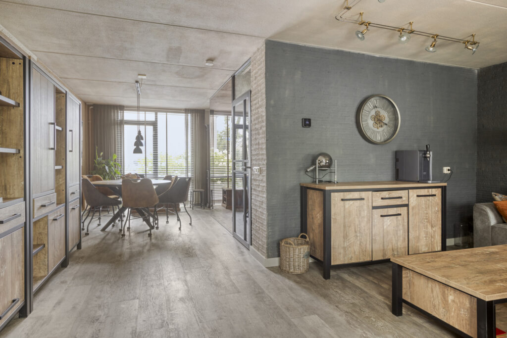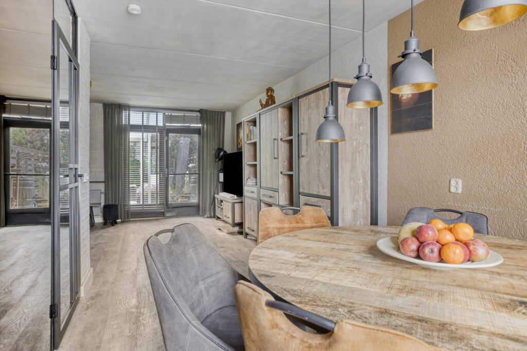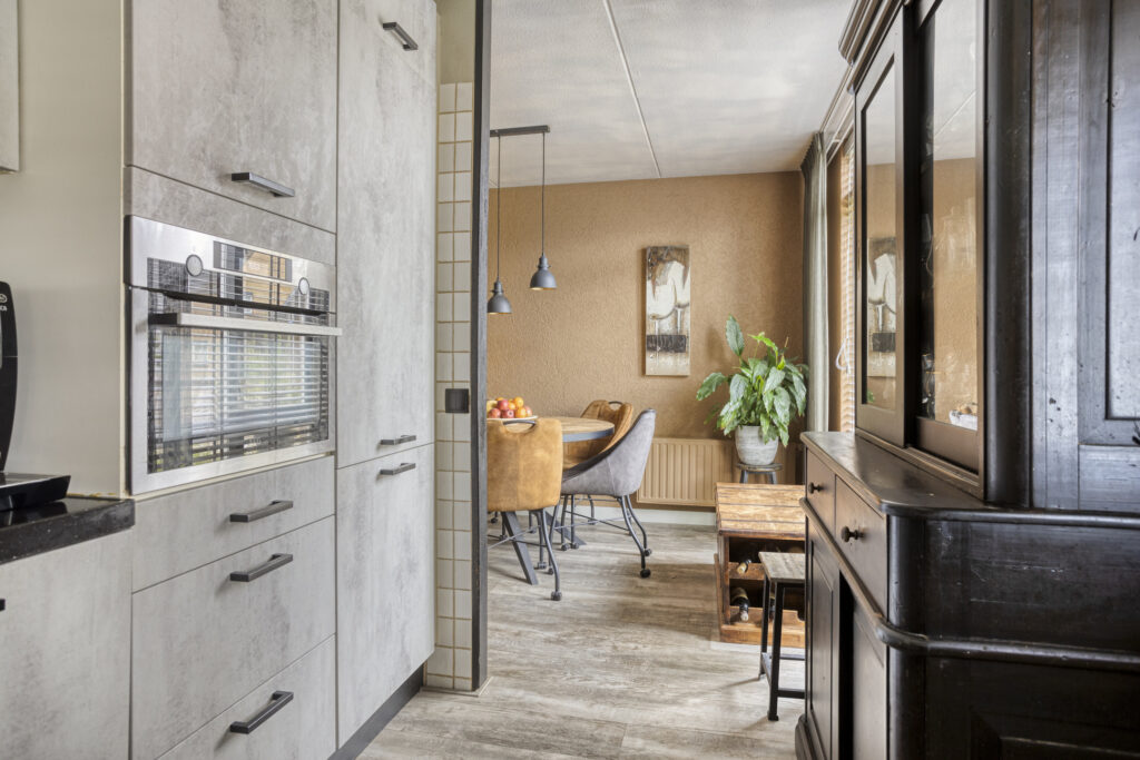 Hal met entree, toilet met wandcloset en fonteintje, vaste kast met meterkast en unit stadsverwarming en trapkast met veel extra bergruimte. De ruime L-vormige woonkamer heeft airconditioning en openslaande tuindeuren naar de veranda. De open keuken is gerenoveerd in 2022 en is gelegen aan de voorzijde van de woning. Qua inrichting is de keuken uitgevoerd met een keukenblok in hoekopstelling met composiet aanrechtblad en diverse boven- en onderkasten. Aan inbouwapparatuur is aanwezig: een 4-pits inductie kookplaat, combi-oven magnetron, vaatwasser, koel-vriescombinatie en een afzuigkap.