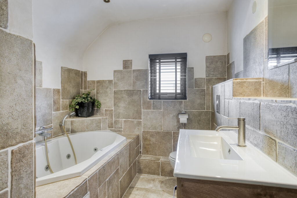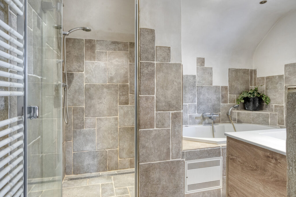 – Nette badkamer voorzien van ligbad met Whirpool, inloopdouche met glazen deur, wastafelmeubel, wandcloset en designradiator.