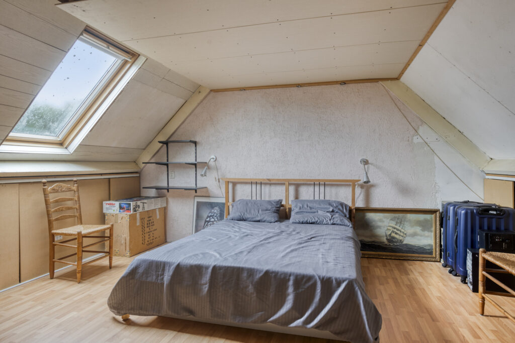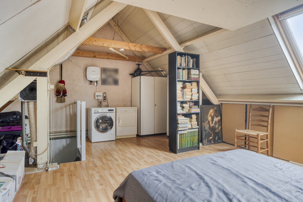 Grote open zolderruimte met veel bergruimte, deze ruimte is uitermate geschikt voor het creëren van een voorzolder en/of twee extra afzonderlijke slaapkamers. Deze ruimte is voorzien van een Velux-dakraam en een praktische bergvliering. Tevens bevinden zich hier de aansluitingen ten behoeve van de wasapparatuur, de omvormer van de zonnepanelen evenals de unit mechanische ventilatie.