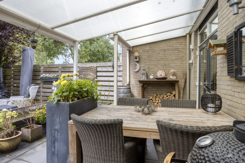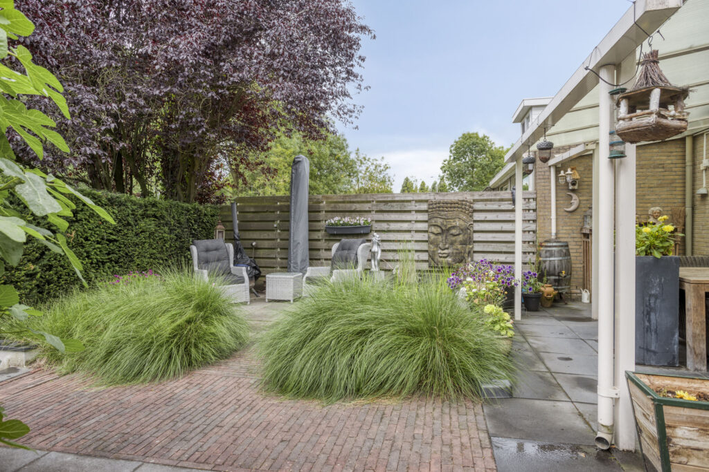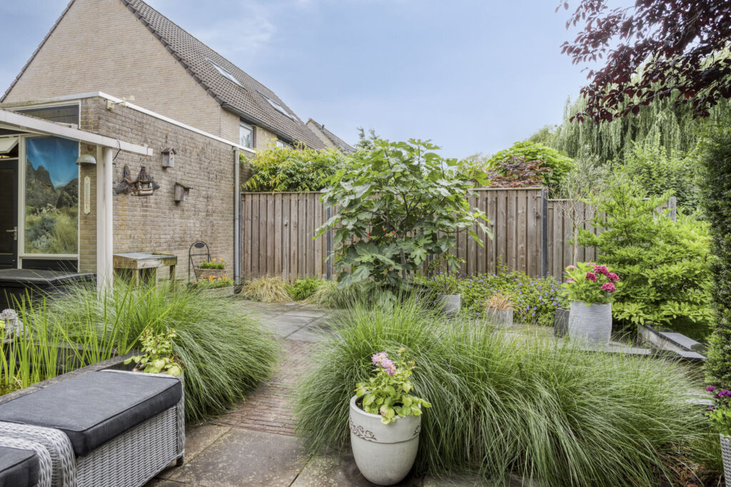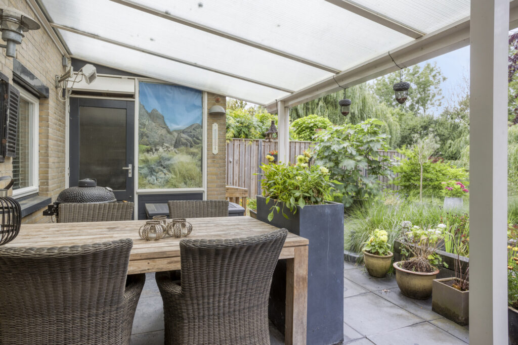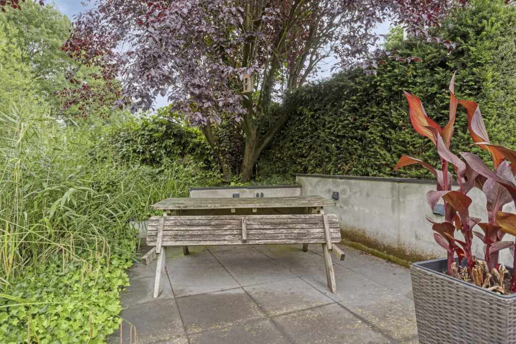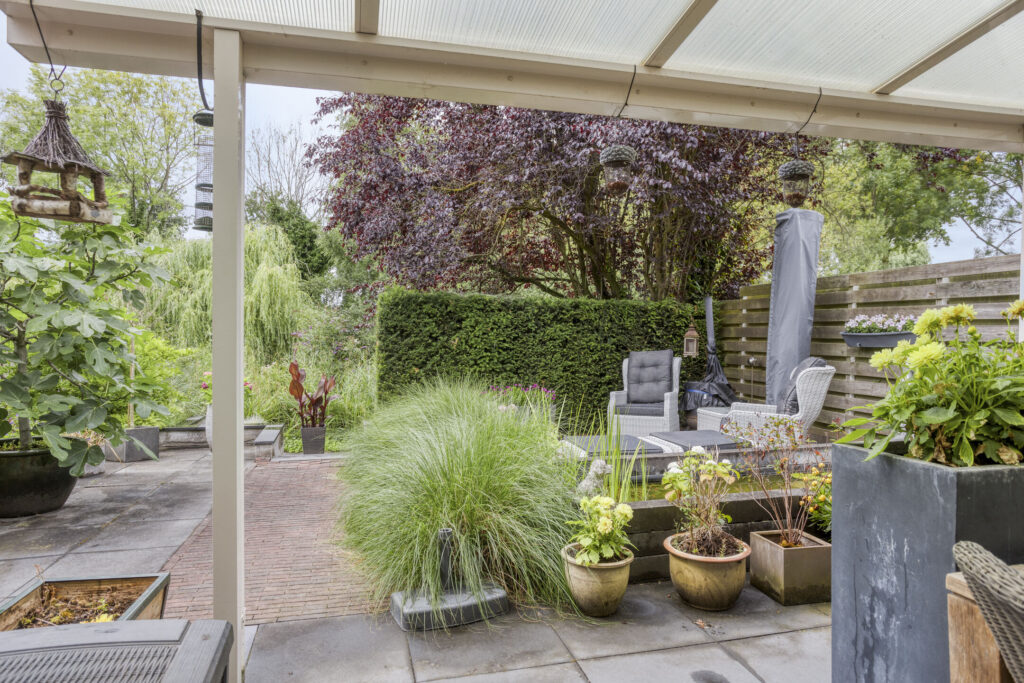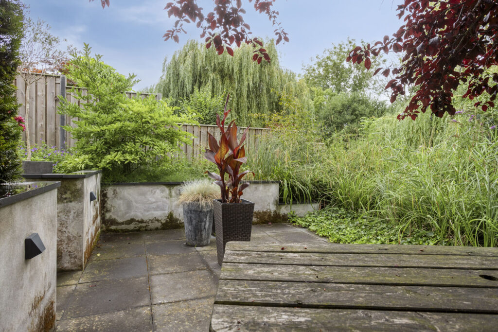 Fraai aangelegde en zonnige achtertuin op het zuidwesten. Het geheel is aangelegd met grote terrastegels, een gezellige veranda, een vijverpartij, borders met diverse volwassen beplanting, elektrapunten en verlichting. Achterin de tuin is een tweede lager terras gelegen met fraai zicht op het water. Tevens treft men hier elektrapunten evenals buitenverlichting.