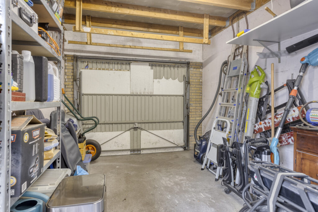 Degelijke garage voorzien van een betonvloer, elektra en een stalen kanteldeur naar de oprit.