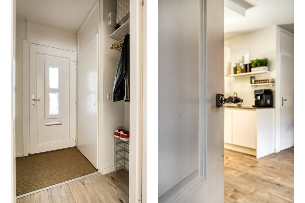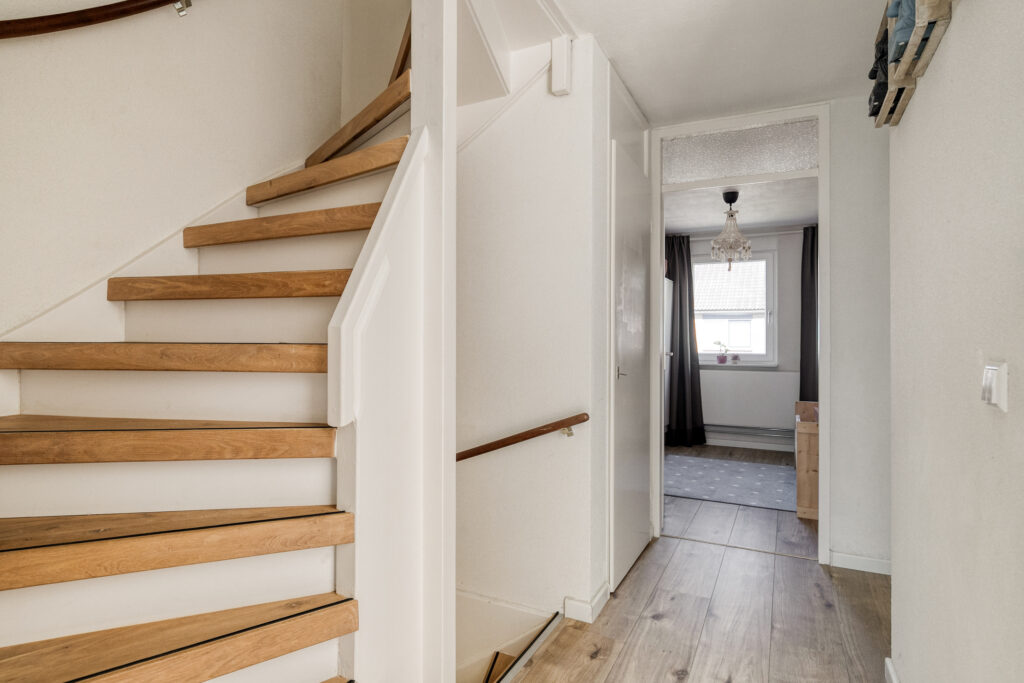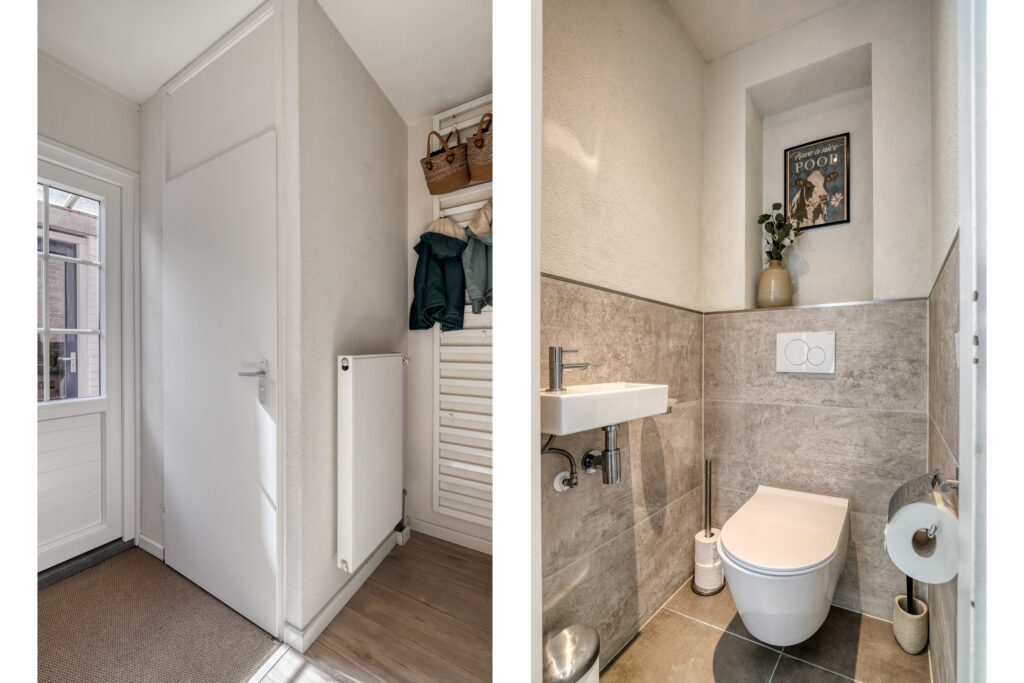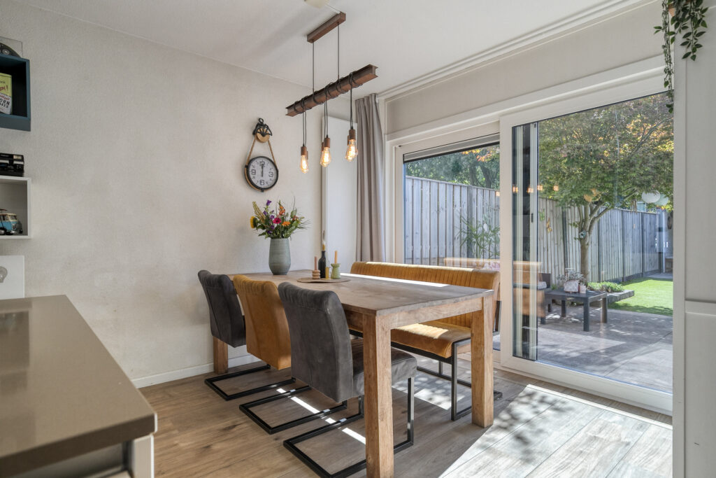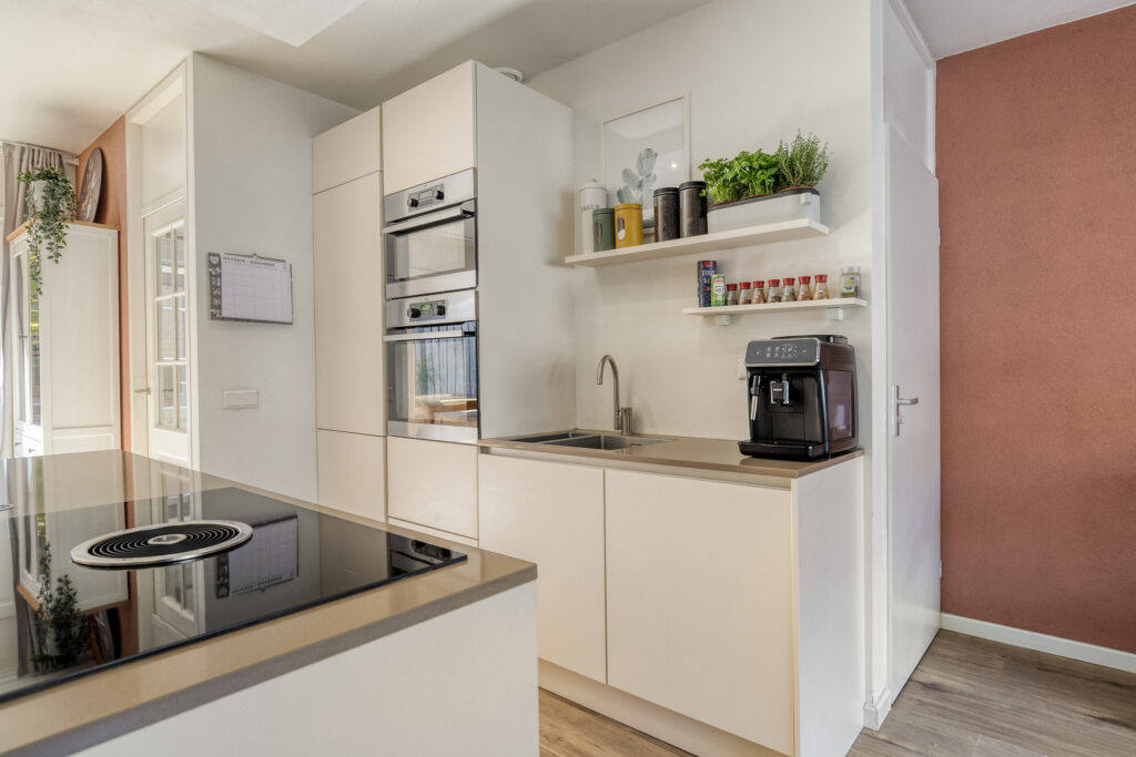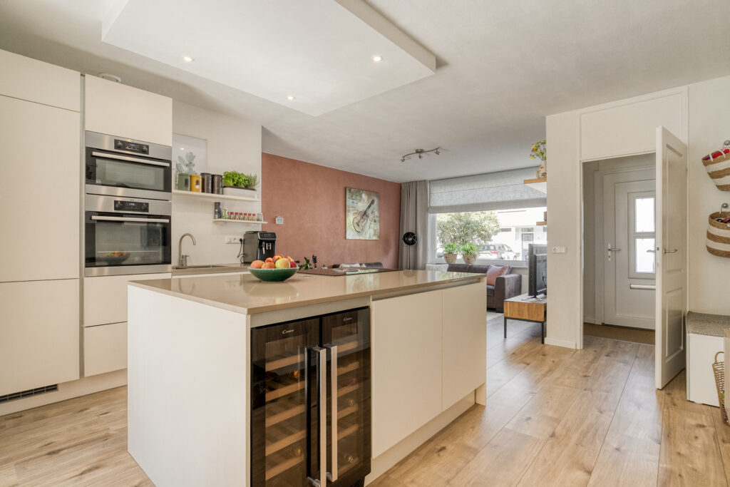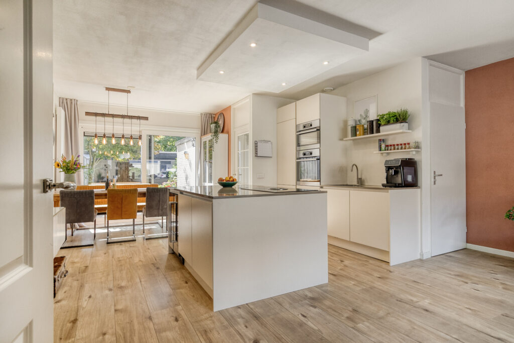 Entree/hal met toegang tot de meterkast en garderobehoek. Vanuit de hal bereikt u de Speels ingedeelde woonkamer en keuken; De gehele begane grond is voorzien van een fraaie laminaatvloer en spachtelputz wanden. Aan de voorzijde van de woning is een gezellige zitkamer gesitueerd met uitzicht op de voortuin/straat. Vanuit de zitkamer heeft u toegang tot de trapkast waarin de warmtewisselaar (stadsverwarming) geplaats is en tevens veel opbergruimte. Open en moderne keuken die zich in het midden van de woning bevind. De keuken heeft de volgende opstelling; een groot kookeiland voorzien van een composiet werkblad en de volgende inbouwapparatuur; Bora inductie kookplaat met ingebouwde afzuiging, wijnklimaatkast en veel opbergruimte in de kastjes en lades; een rechte wandopstelling tevens voorzien van composiet werkblad en de volgende inbouwapparatuur; oven, combimagnetron, koelkast, vrieslades en 1 1/2 spoelbak. Aan de achterzijde van de woning is de ruimte voor het plaatsen van een 6-persoonseetkamer tafel. Vanuit hier heeft u een prachtig uitzicht op de achtertuin die u middels een grote schuifpui (met hor) kunt bereiken. Ook heeft u vanuit hier toegang tot de achter hal welke toegang biedt tot de vernieuwde toiletruimte met hangend closet en fonteintje, de trapopgang naar de 1e verdieping en een loopdeur naar de achtertuin.