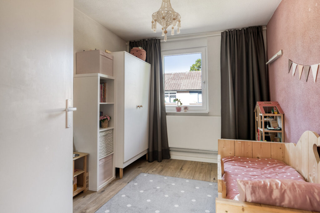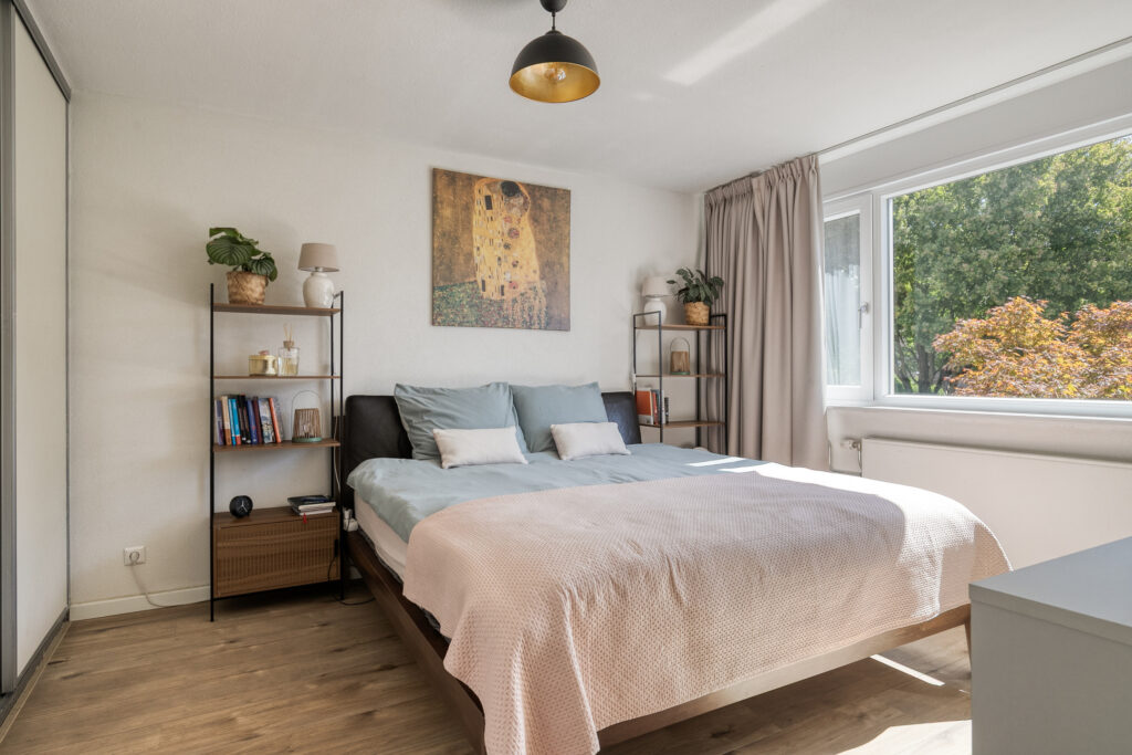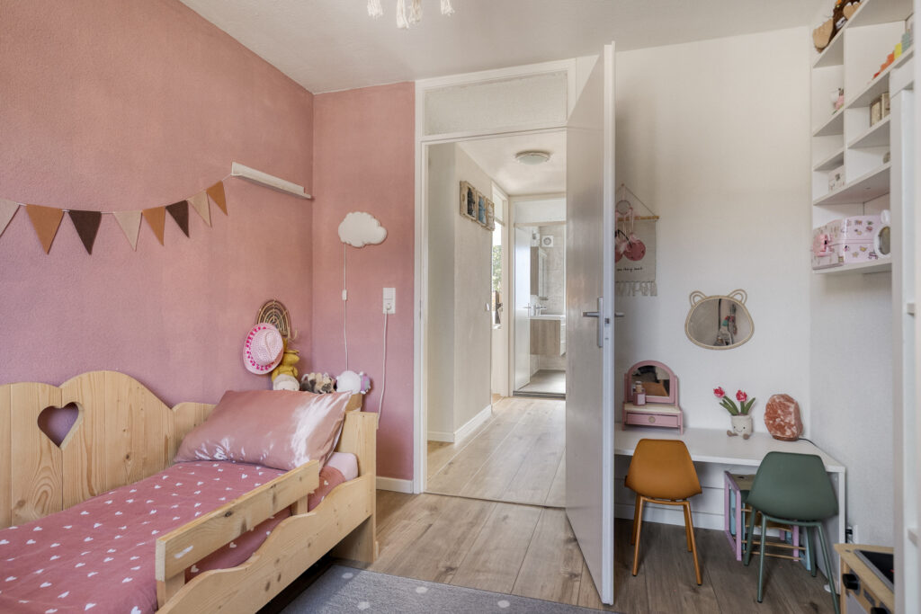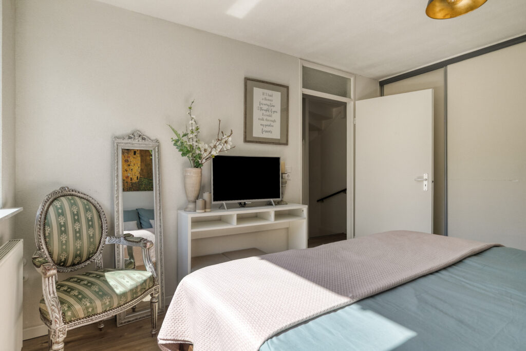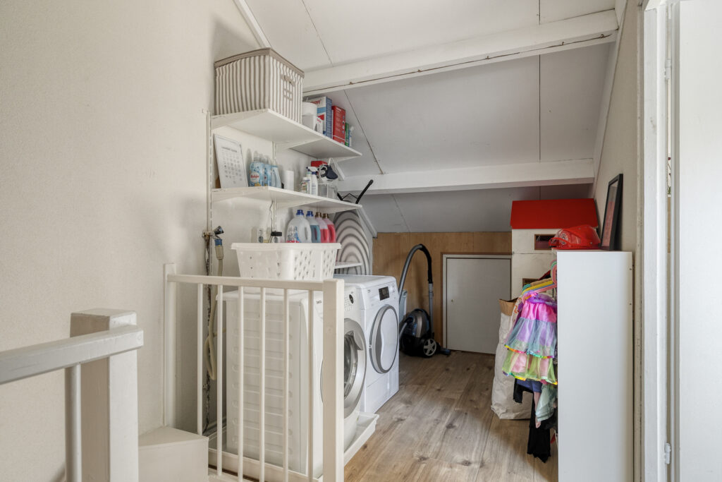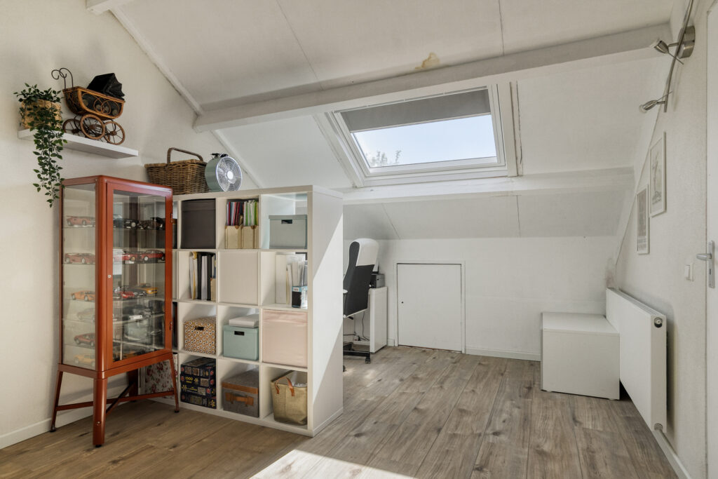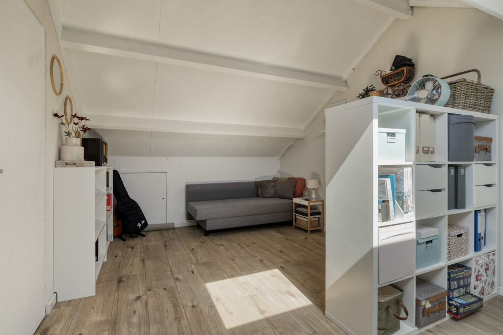Middels een vaste trap bereikt u de voorzolder hier treft u de aansluiting voor de was- en droogapparatuur en de opstelplaats van de mechanische ventilatie-unit. Achter de schotten is veel bergruimte aanwezig. Ruime zolderslaapkamer met vernieuwd kunststof Velux dakraam, op de vloer ligt nette laminaat en er is voldoende bergruimte achter de knieschotten aanwezig.