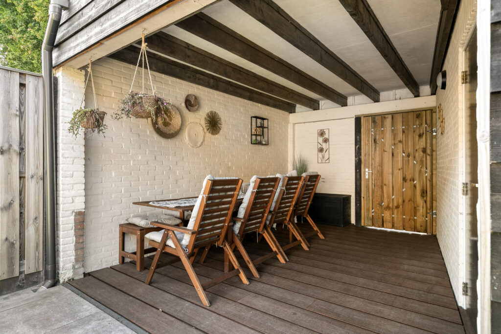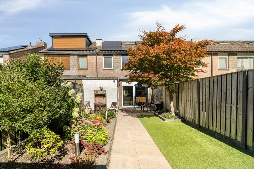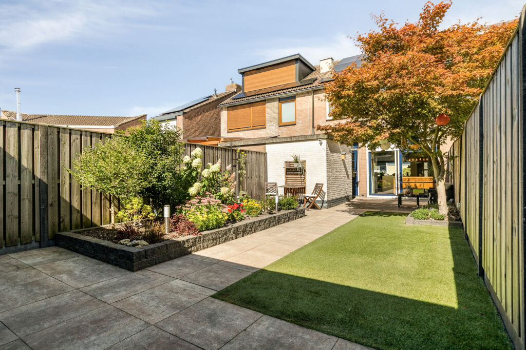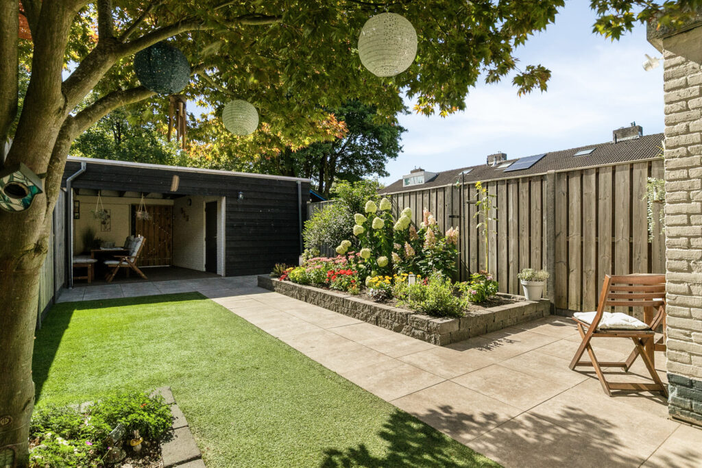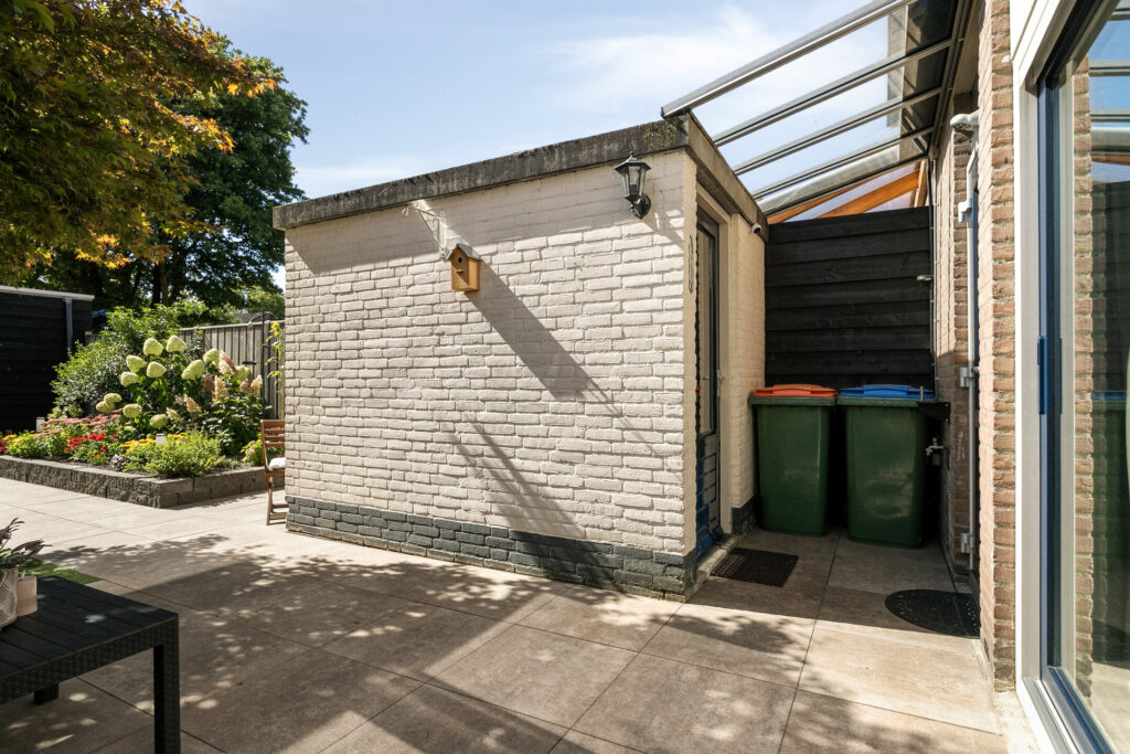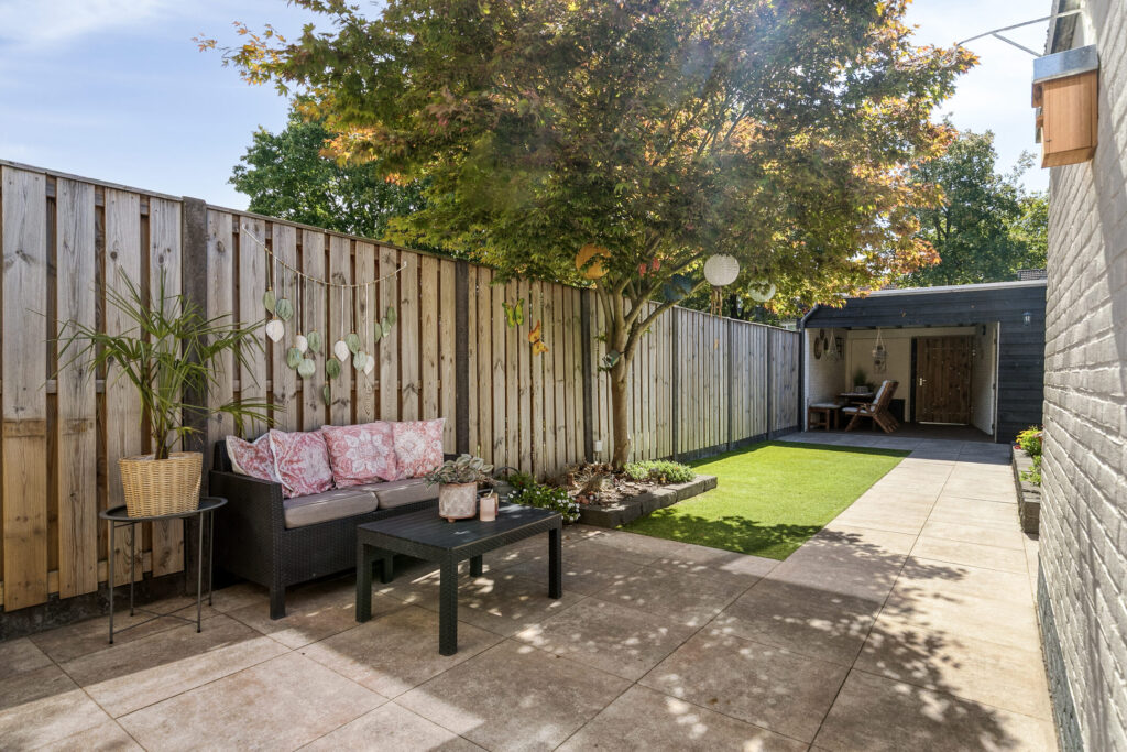 De woning is voorzien van een ruime voortuin welke is ingedeeld in een grote border met beplanting en een groot betegelde oprit met de ruimte voor 1 of 2 auto’s. De fraai aangelegde en privacy biedende achtertuin is gelegen op het zonnige zuiden. U treft hier een groot betegeld terras aan de woning met elektrisch zonnescherm. Vanuit de achterdeur heeft u toegang tot de vrijstaande stenen berging met electra. De ruimte tussen de achterdeur en de berging heeft een handige overkapping zodat ook uw kliko’s droog staan. In het middelste gedeelte van de tuin treft u een gazon met kunstgras, een grote border met volwassen beplanting en als pronkstuk een prachtige “Japanse es”. Achterin de tuin treft u een overkapping aan met toegang tot de 2e ruime berging. Onder de overkapping is een gezellig terras met kunststof vlonders gecreëerd en deze is fraai afgewerkt met houten rabatdelen. Middels een verbrede poort (achterom) is het speelveldje aan de achterzijde van de woning bereikbaar. De achtertuin beschikt tevens over een buitenkraantje, verlichting en electra punten.