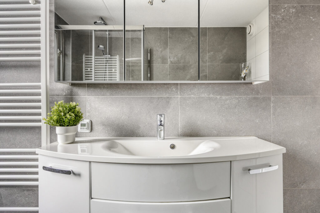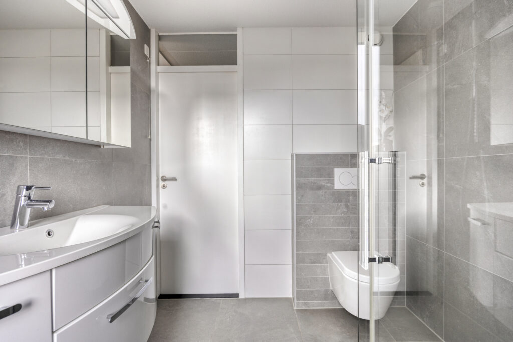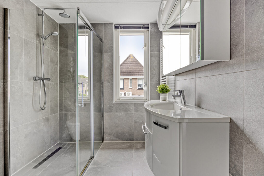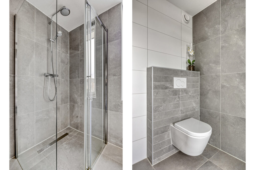 – Moderne en hoogwaardig afgewerkte badkamer met vloerverwarming, inloopdouche, wandcloset, handdoekradiator, wastafelmeubel en spiegelkast