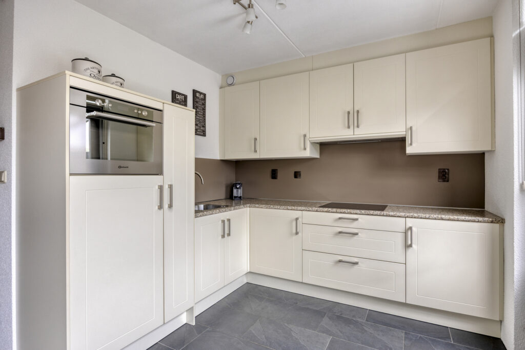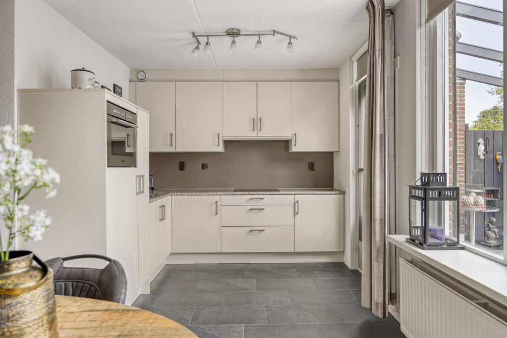 Entree/hal met toegang tot de woonkamer en de vaste kast met meterkast en unit stadsverwarming. De royale L- woonkamer is ca. 35 m² groot, heeft veel lichtinval en biedt mooi uitzicht over de tuin en het speelveld aan de voorzijde. De open keuken is gelegen aan de achterzijde en is voorzien van een keukeninrichting in hoekopstelling met diverse boven- en onderkasten. Aan inbouwapparatuur is aanwezig een inductie kookplaat, afzuigkap, combi oven en koelkast. Er is ruimte voor een vaatwasmachine. Vanuit de keuken is er toegang tot de tuin en de veranda. Vanuit de woonkamer is de tussenhal bereikbaar, hier bevindt zich de toiletruimte met fonteintje en de trapopgang naar de 1e verdieping.