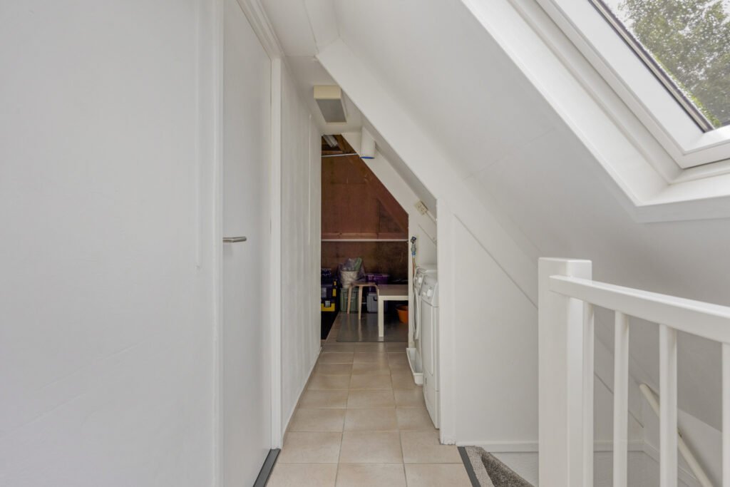 Ruime voorzolder met kunststof Velux dakraam en aansluitingen voor was- en droogapparatuur.