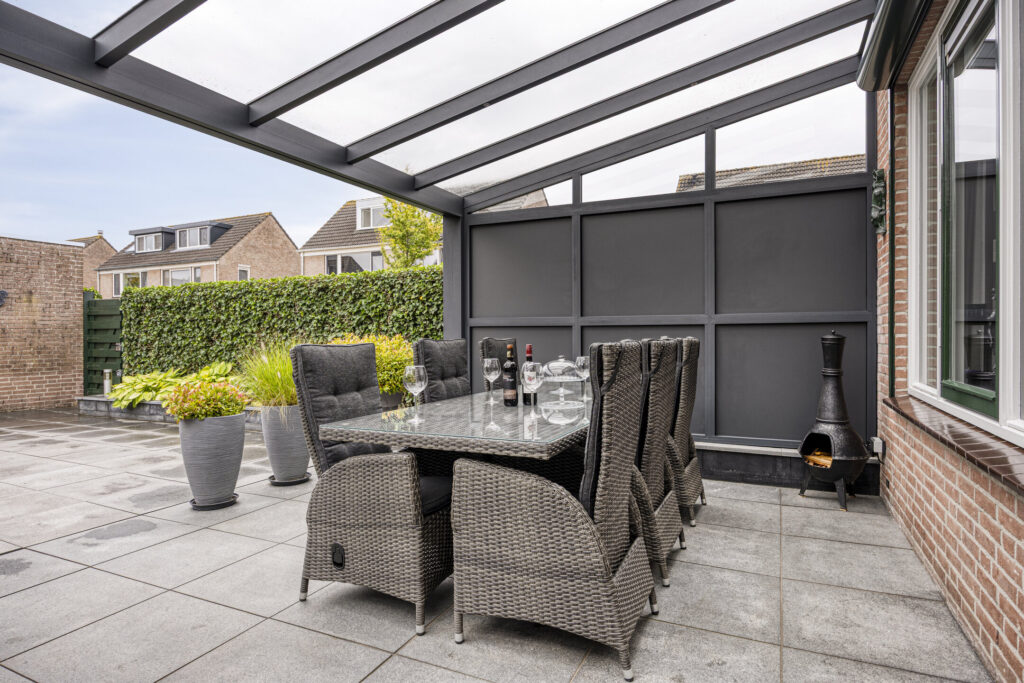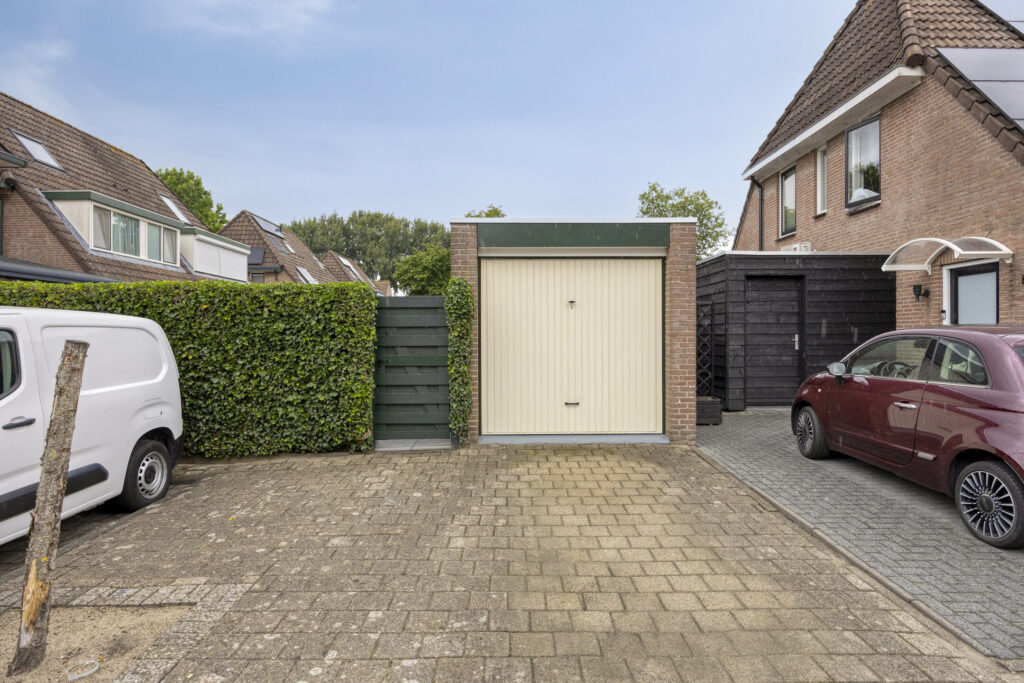 Ruime en zonnige tuin met achterom, grote veranda van ca. 20m² en de vrijstaande garage. De garage is voorzien van elektra.