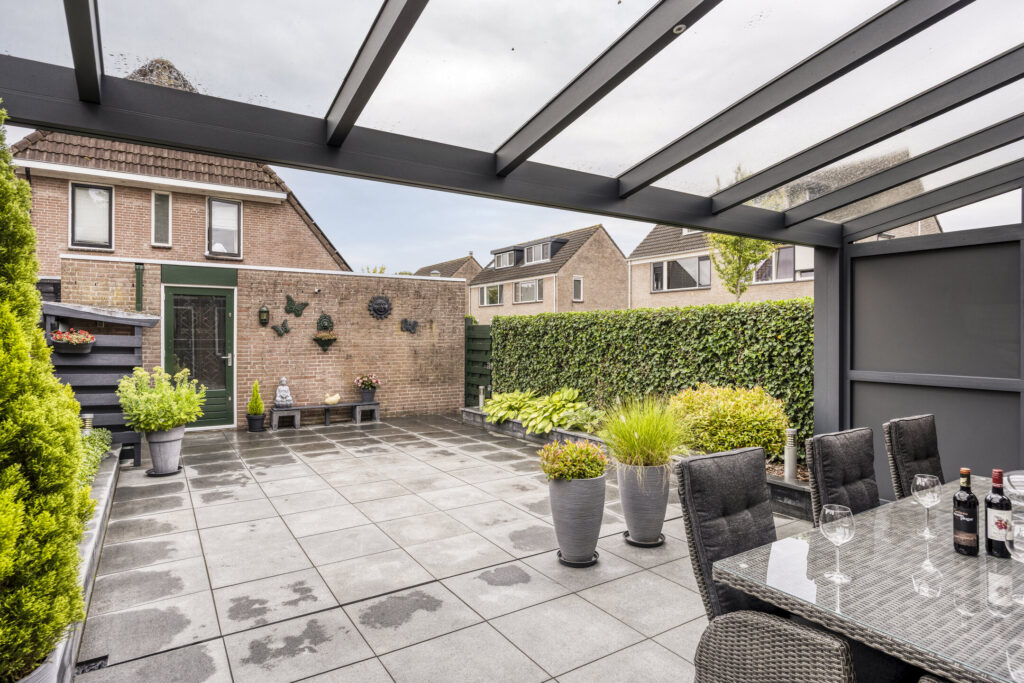 De achtertuin is ca. 10m diep en is gelegen op het zuidoosten. De tuin is fraai ingericht met een veranda, grote terrastegels, borders met vast groen en degelijke erfafscheiding. Verder heeft de tuin buitenverlichting, een buitenkraan, een overkapping voor afvalcontainers en een drainagesysteem voor soepele afwatering. De fraaie aluminium veranda (Pallazzo) is uitgevoerd met verlichting en heeft de mogelijkheid voor het plaatsen van harmonicadeuren. Middels een poort is er toegang tot de straatzijde. De voortuin is eveneens verzorgd ingericht met vast groen en is omheind met een laag stalen hekwerk.