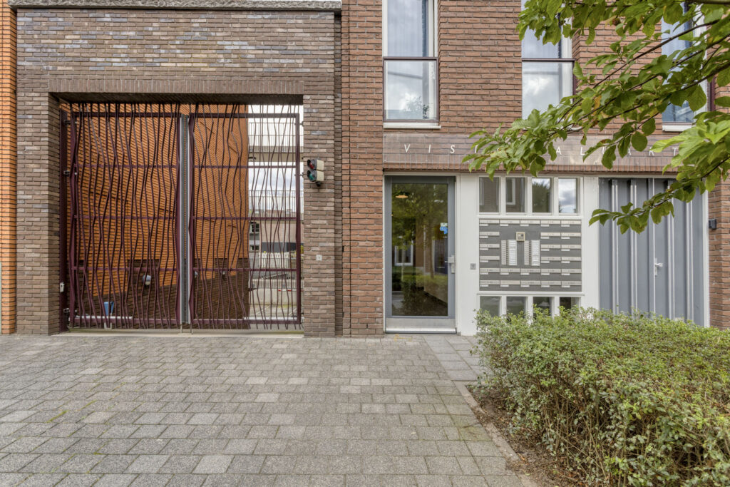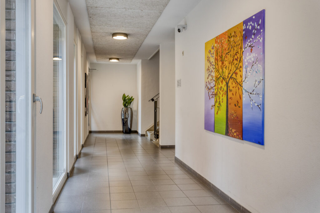 Afgesloten centrale entree met intercom, brievenbussen, toegang tot de lift en het trappenhuis, toegang tot de bergingen en tot het afgesloten parkeerterrein met de eigen parkeerplaats.