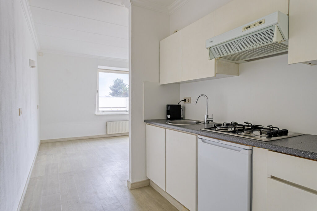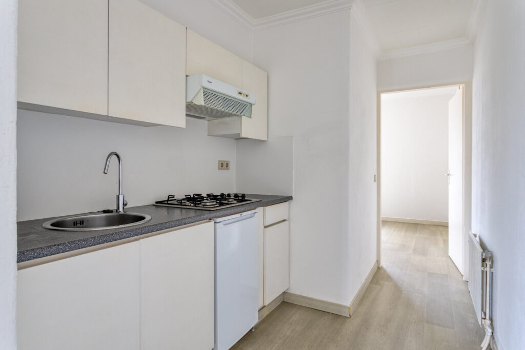Hal met entree, meterkast, toiletruimte; ruime woonkamer aan de voorzijde (ca. 18m², 4.75 x 3.65m); open keuken met keukenblok voorzien van 4-pits gaskookplaat, afzuigkap en nieuwe koelkast (ca. 2.05 x 2.00 m); vaste kast met opstelplaats van de cv-ketel; slaapkamer I aan de achterzijde met toegang tot het balkon (ca. 3.80 x 3.10m en balkon ca. 1.00 x 1.85m); badkamer voorzien van douchecabine, wastafelmeubel en aansluiting wasapparatuur (ca. 2.75 x 0.90 m).