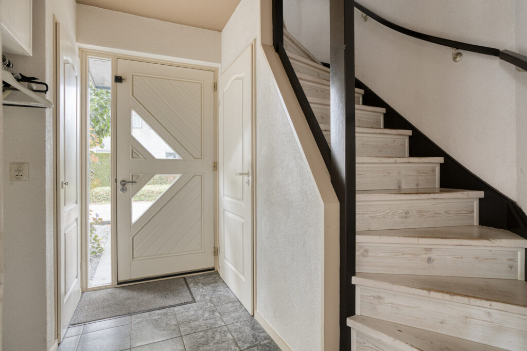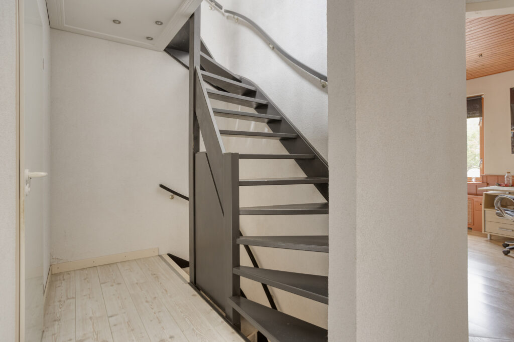 Overloop met toegang tot 3 slaapkamers, de badkamer en de trapopgang naar de tweede verdieping.