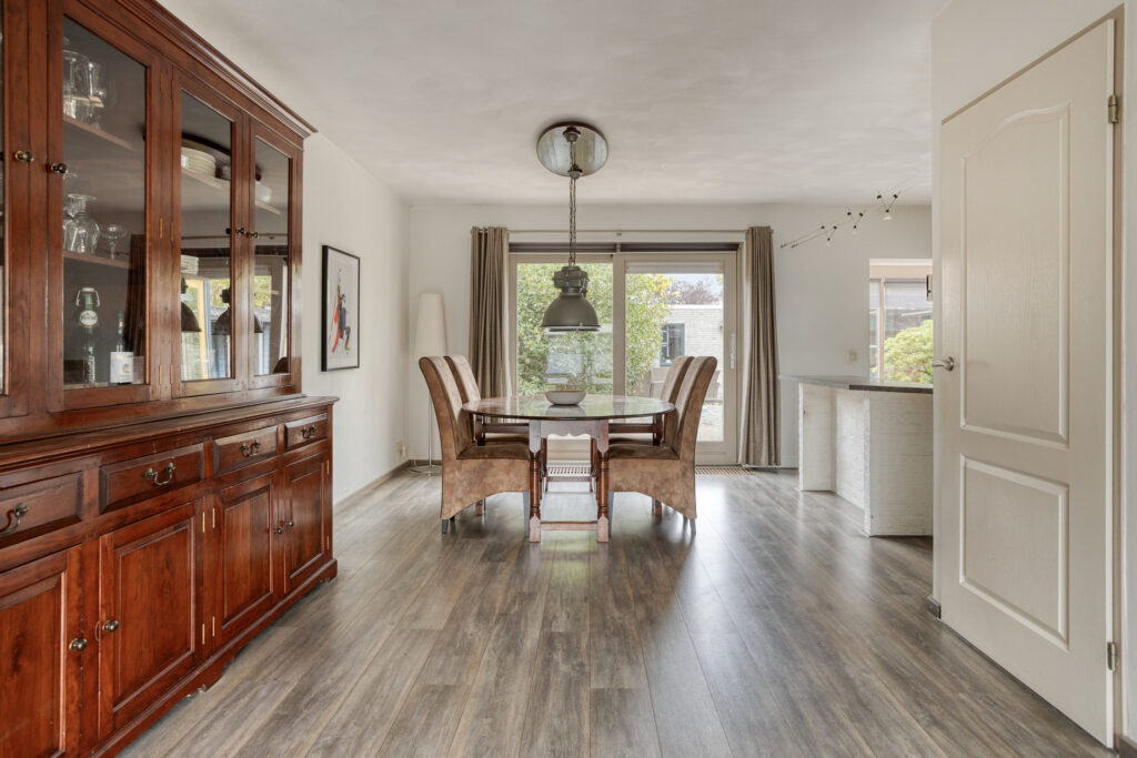 Overdekt zij-entree/hal met toegang tot de trapopgang naar de eerste verdieping, meterkast en de toiletruimte voorzien van staand toilet met fonteintje. De royale woonkamer heeft door zijn omvang en vele raampartijen veel natuurlijk lichtinval. De open (eet)keuken is gelegen aan de achterzijde en biedt toegang tot de tuinkamer evenals de tuin middels een schuifpui. De open keuken is voorzien van een hoekopstelling met bar en diverse onder- en bovenkasten. Aan inbouwapparatuur is aanwezig: 5-pits gaskookplaat, RVS afzuigkap, koelkast, vaatwasser en een oven. Via een open doorgang is de tuinkamer te bereiken met toegang tot de bijkeuken. De ruimtelijke tuinkamer heeft veel lichtval door de grote raampartijen en via een loopdeur is de tuin/terras bereikbaar. De bijkeuken is voorzien van de aansluiting voor de was- en droogapparatuur en dient tevens als opstelplaats voor de CV-combiketel.