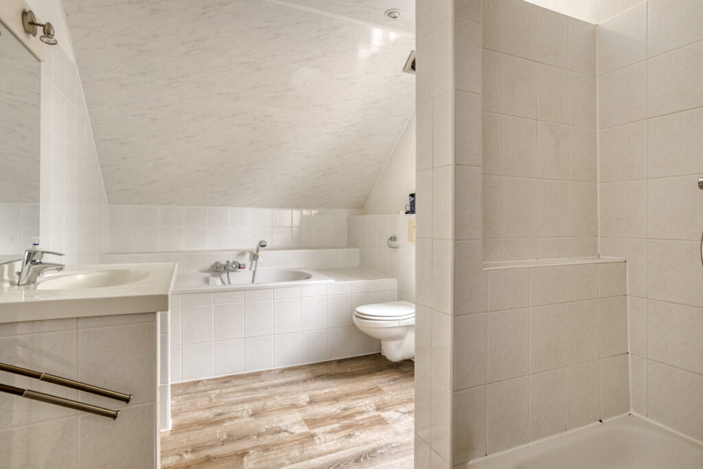 – Geheel betegelde badkamer voorzien van een douche met regen- en handdouche, tweede toilet, wastafel in meubel en ligbad.