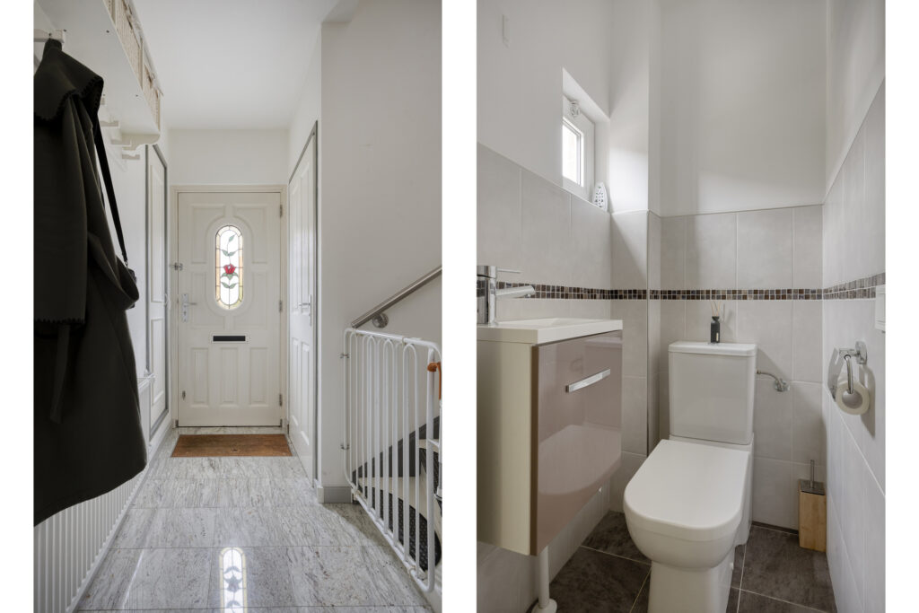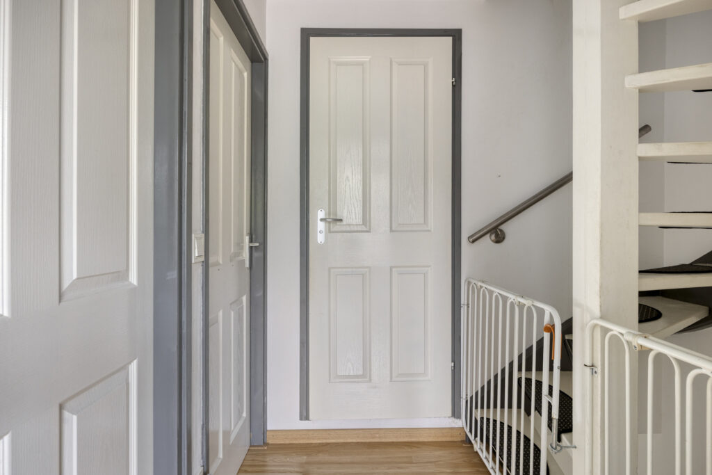 Hal/ entree voorzien van een tegelvloer, trapopgang naar de eerste verdieping, meterkast, trapkast met veel opbergruimte en de deels betegelde toiletruimte met staand closet en fonteintje.
