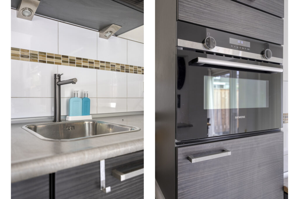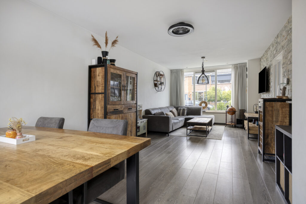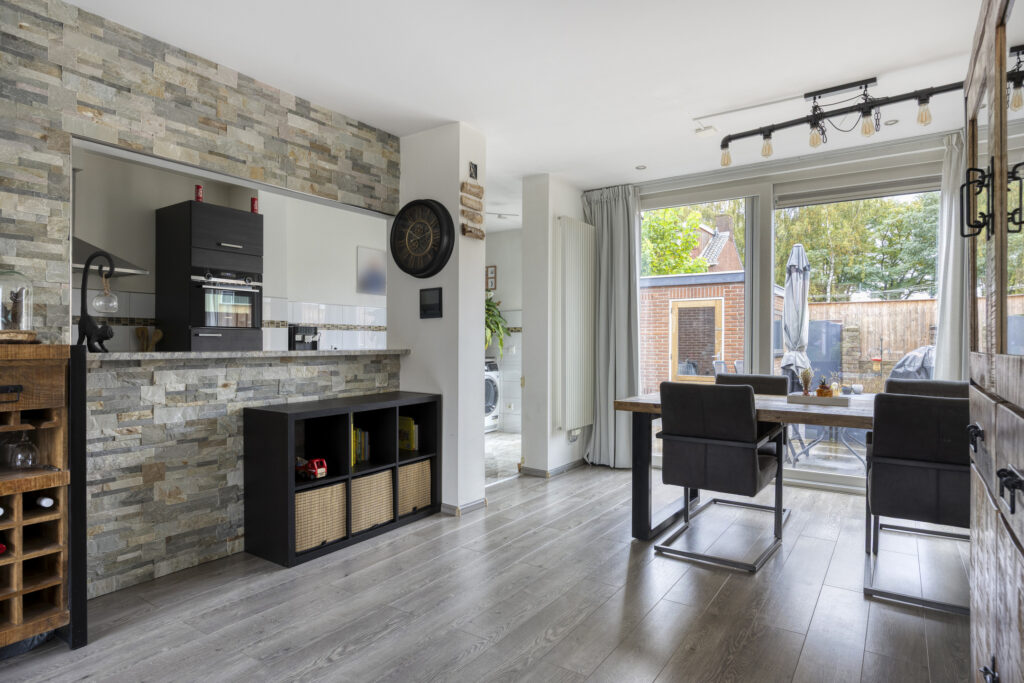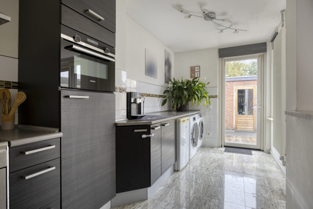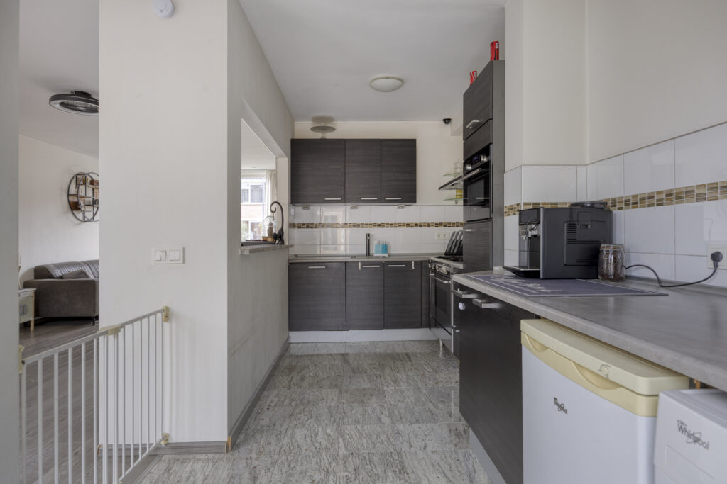 Lichte en ruime woonkamer voorzien van een laminaatvloer en strakke stucwerk wanden en plafond. Vanuit de woonkamer heeft u middels een schuifpui (met hor en rolluik) toegang tot de achtertuin. Semi-open en uitgebouwde keuken, voorzien van een L-vormige inrichting in een moderne kleurstelling voorzien van een 5-pits gasfornuis met grote oven (Smeg), afzuigkap, RvS spoelbak, koelkast, vaatwasmachine en combimagnetron. De keuken is tevens voorzien van onder- en bovenkasten met veel opbergruimte. Aan de achterzijde van de keuken is de aansluiting voor de was- en droogapparatuur en een loopdeur die toegang biedt naar de achtertuin.
