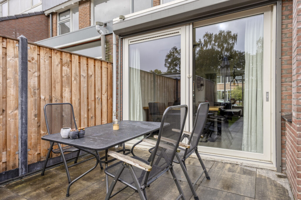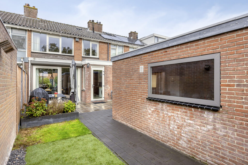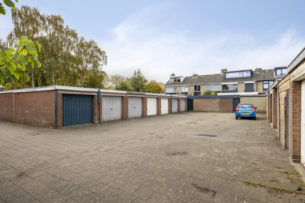De woning heeft zowel een fraai aangelegde voor- en achtertuin. De voortuin heeft twee vaste plantenbakken met grind. De fijne, onderhoudsvriendelijke achtertuin met veel privacy is gelegen op het zuidoosten en heeft een achterom, kunstgras en een betegeld terras. De garage is via een loopdeur vanuit de tuin toegankelijk. Vanuit het pleintje aan de achterzijde is de garage middels een kanteldeur bereikbaar. De garage is voorzien van elektra.