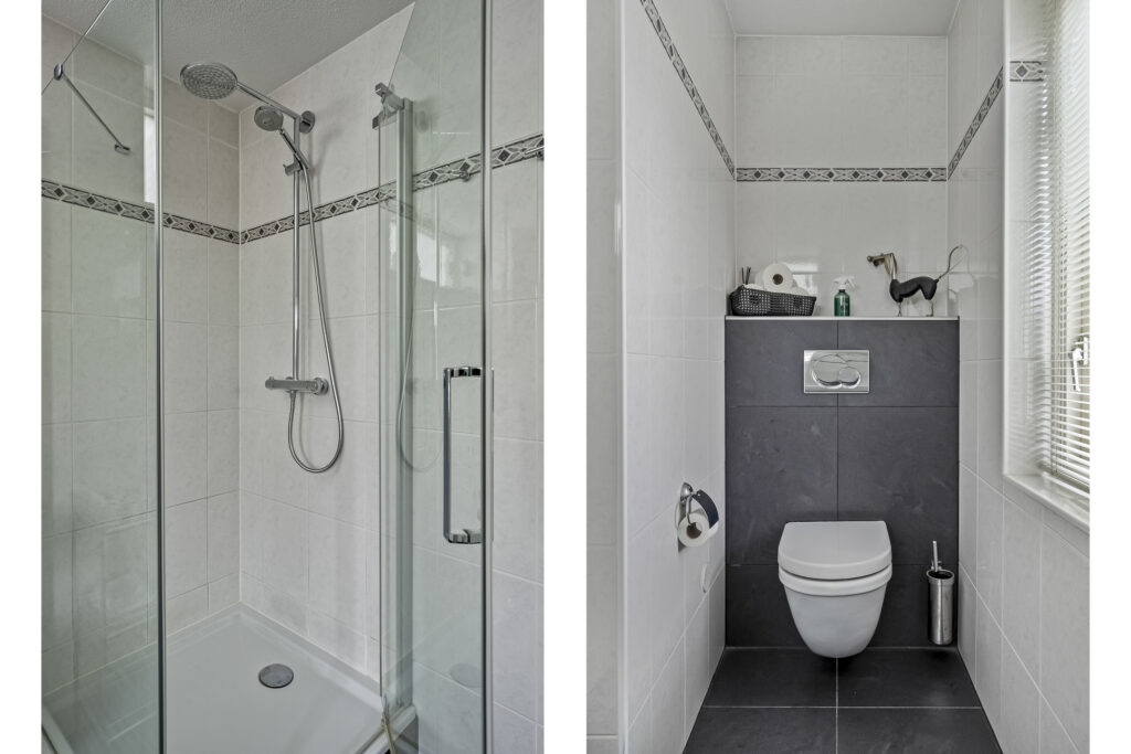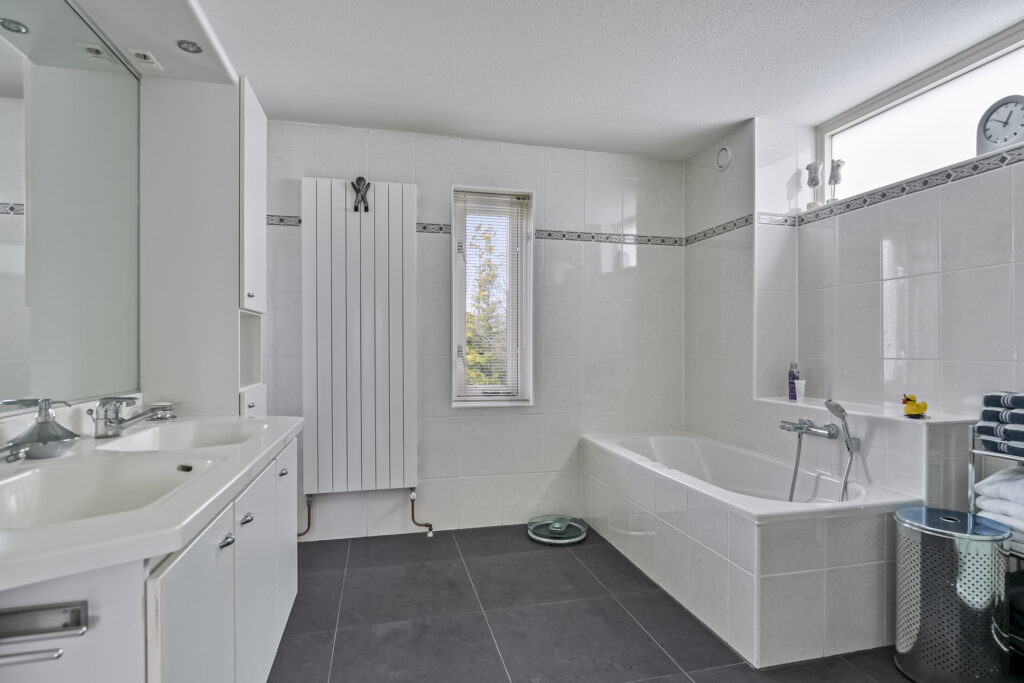 De ruime badkamer is voorzien van een douchecabine, ligbad, toilet en een wastafelmeubel met een extra brede wastafel voorzien van twee kranen. Voor de verwarming is er een designradiator aanwezig en vloerverwarming. Daarnaast is de badkamer voorzien van mechanische ventilatie.