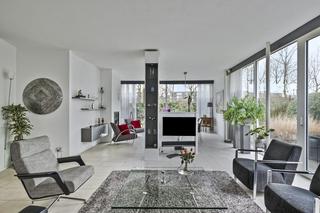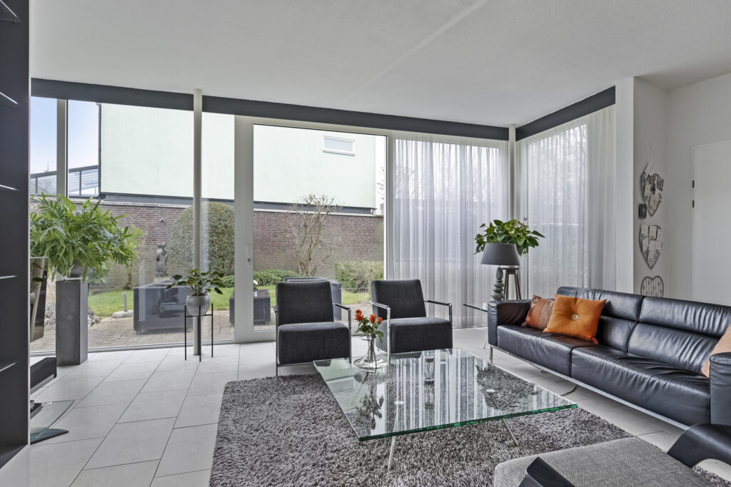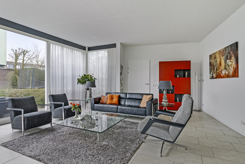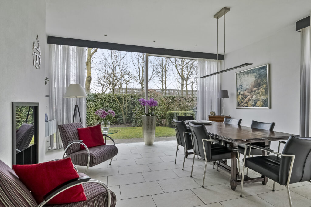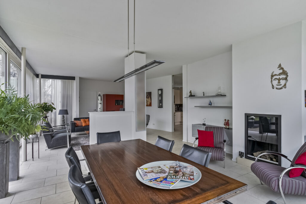 De lichte, sfeervolle en uitgebouwde woonkamer biedt een zee van ruimte en heeft een perfecte lichtinval doordat er nagenoeg volledig gebruik gemaakt is van veel glas. Bovendien heeft u zo een volledig vrij uitzicht op de tuin, die u bereikt via een grote aluminium schuifpui (2024) aan de zijkant van de woonkamer. Achterin de woonkamer is een sfeervolle gashaard aanwezig. De woonkamer is voorzien van een plavuizenvloer met vloerverwarming en stucwerk wandafwerking.