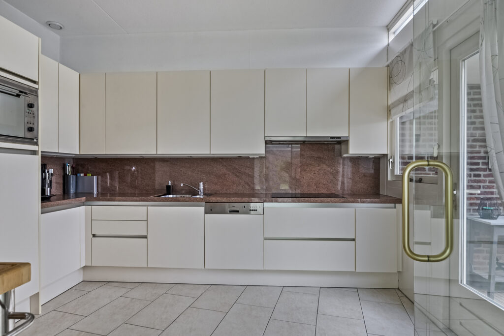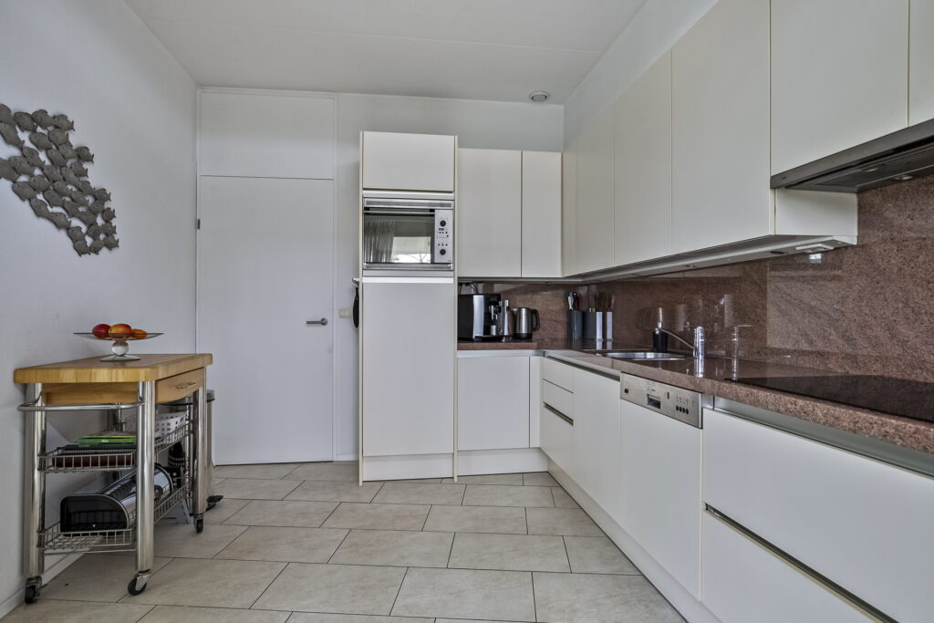 Via de woonkamer is de keuken bereikbaar. De ruime keuken heeft een keukeninrichting in een hoekopstelling. De keuken is voorzien van inbouwapparatuur te weten: een koelkast, combi-oven, 4 pits inductie kookplaat met een afzuigschouw. Een marmeren werkblad maakt het geheel compleet. Via een loopdeur heeft u toegang tot de achtertuin.