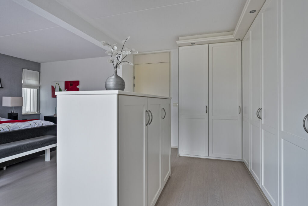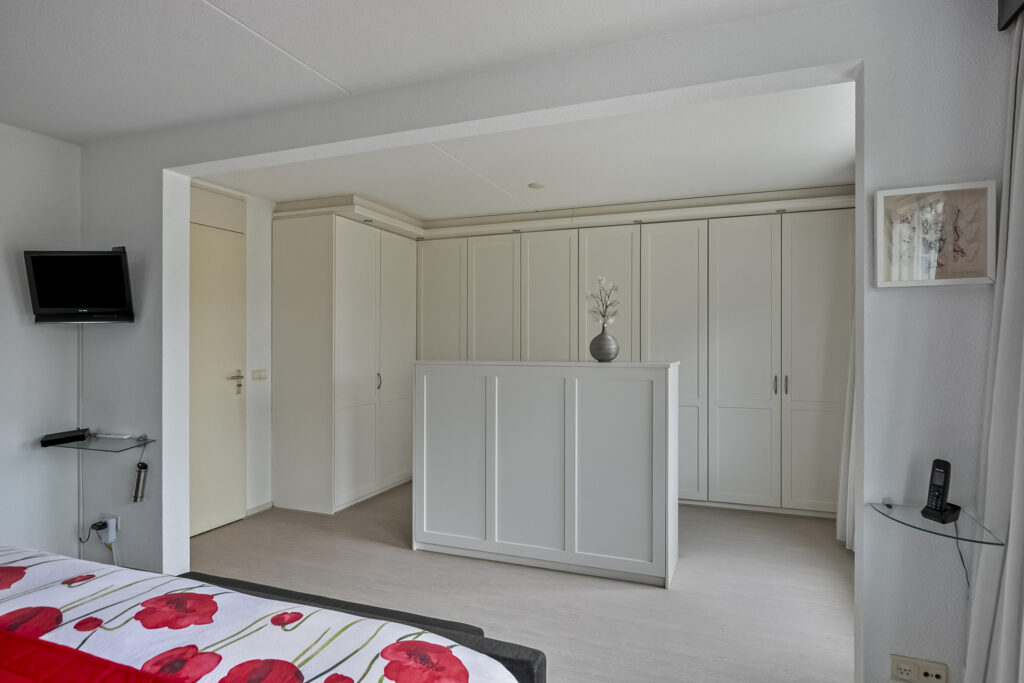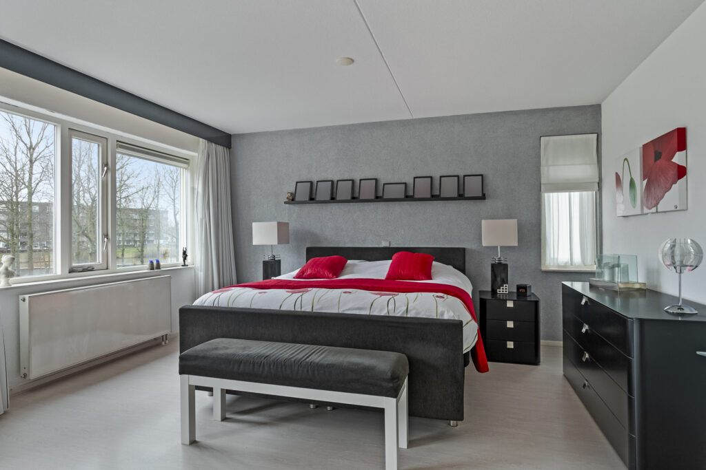 * Riante slaapkamer (oorspronkelijke twee slaapkamers). Deze slaapkamer ligt aan de achterzijde en heeft zowel aan de voorzijde als aan de zijkant een raam waardoor het een hele lichte kamer is. Er is een grote vaste kast aanwezig en de ramen zijn voorzien van elektrische screens.