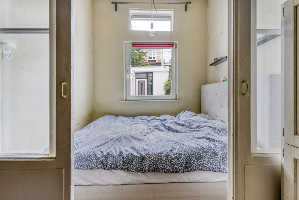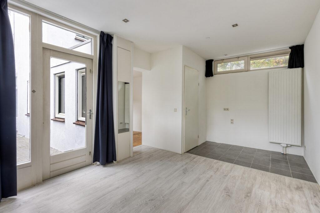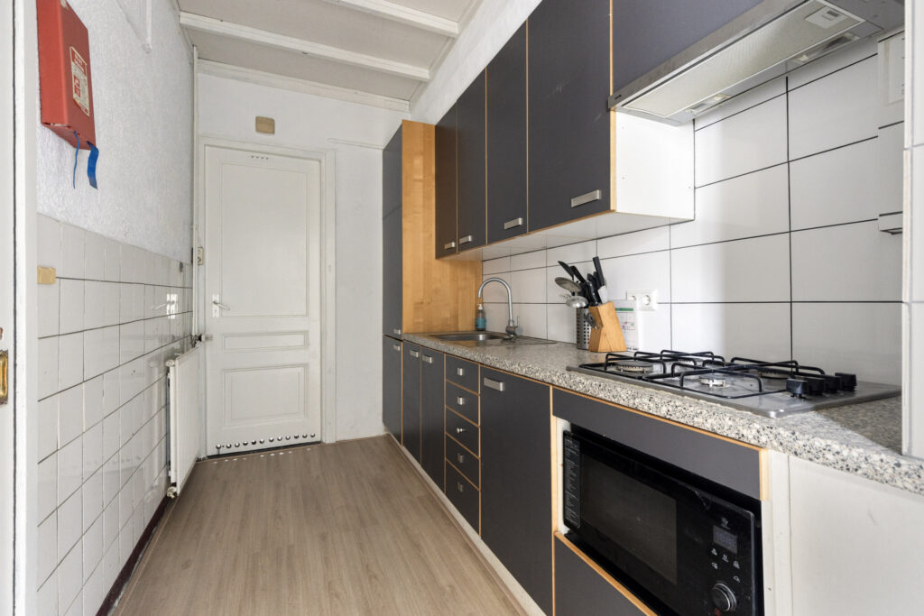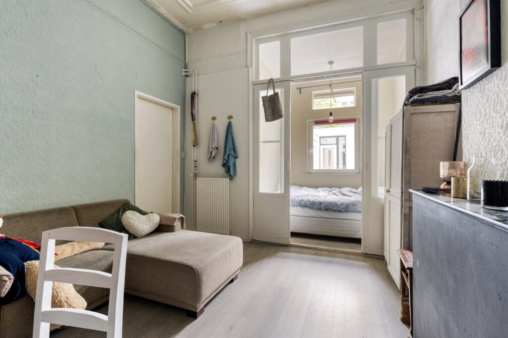 Slaapkamer I gelegen aan de voorzijde van de woning met een plafondhoogte van ruim 3 meter, schouw en inbouwkasten. Eenvoudige keuken in een rechte opstelling voorzien van onder- en bovenkasten, 4-pits gaskookplaat, afzuigkap, combi-oven en spoelbak. Slaapkamer II / woonkamer vanuit de keuken bereikbaar, ruime woonkamer met aansluitend slaapkamer voorzien van laminaatvloer, schouw, schuifdeuren en vaste kasten.