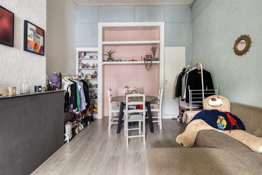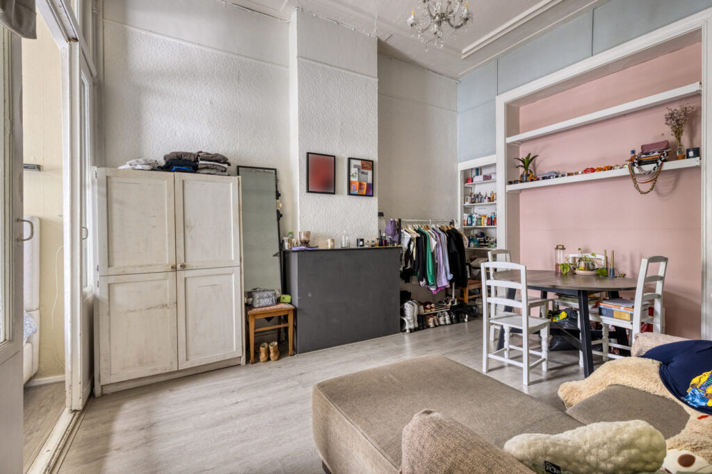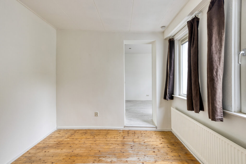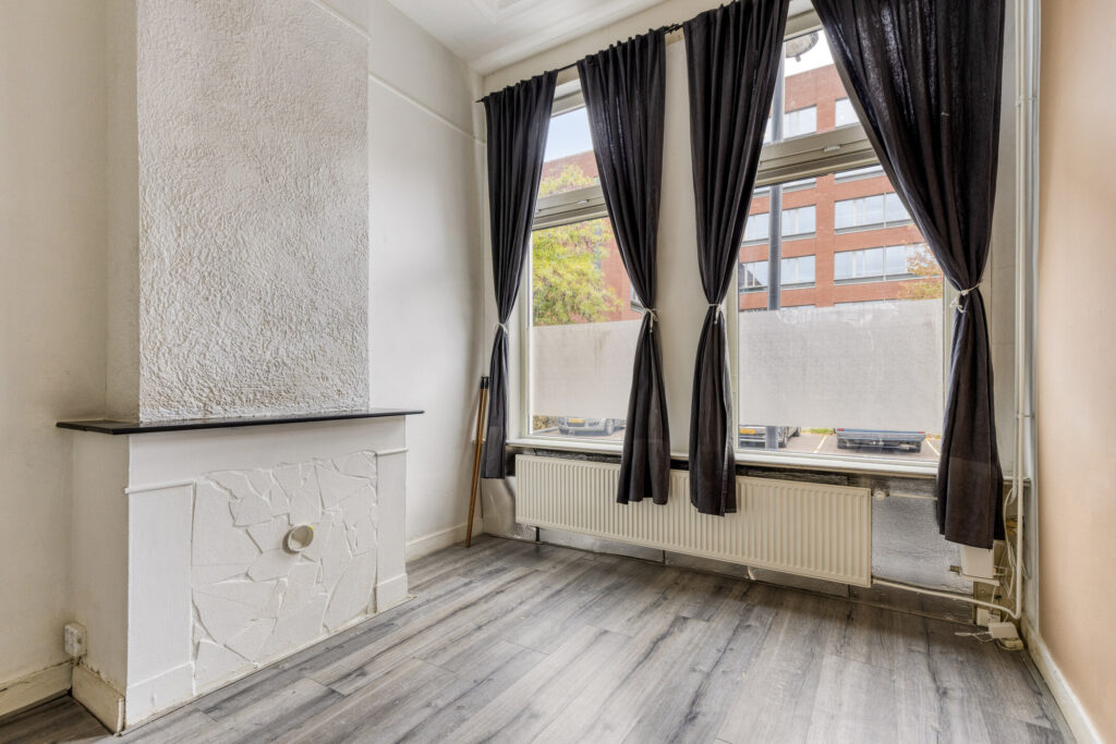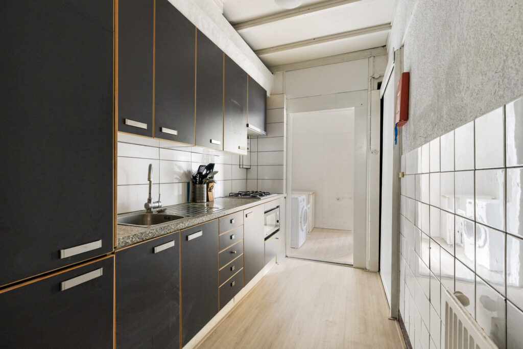 Slaapkamer I gelegen aan de voorzijde van de woning met een plafondhoogte van ruim 3 meter, schouw en inbouwkasten. Eenvoudige keuken in een rechte opstelling voorzien van onder- en bovenkasten, 4-pits gaskookplaat, afzuigkap, combi-oven en spoelbak. Slaapkamer II / woonkamer vanuit de keuken bereikbaar, ruime woonkamer met aansluitend slaapkamer voorzien van laminaatvloer, schouw, schuifdeuren en vaste kasten.