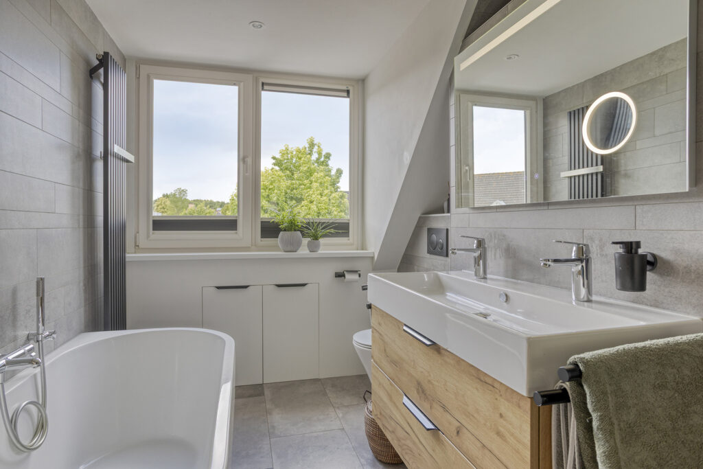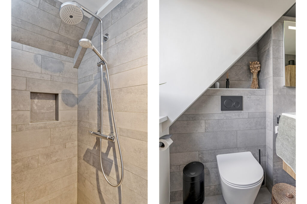 – Moderne, geheel betegelde badkamer (2022), voorzien van een inloopdouche met regen- en handdouche, tweede toilet, wastafelmeubel met dubbele kraan, ligbad met handdouche, wandkast en designradiator. De badkamer is voorzien van een dakkapel met draai/kiep raam. Achter de schuine kant is er nog extra bergruimte aanwezig.
