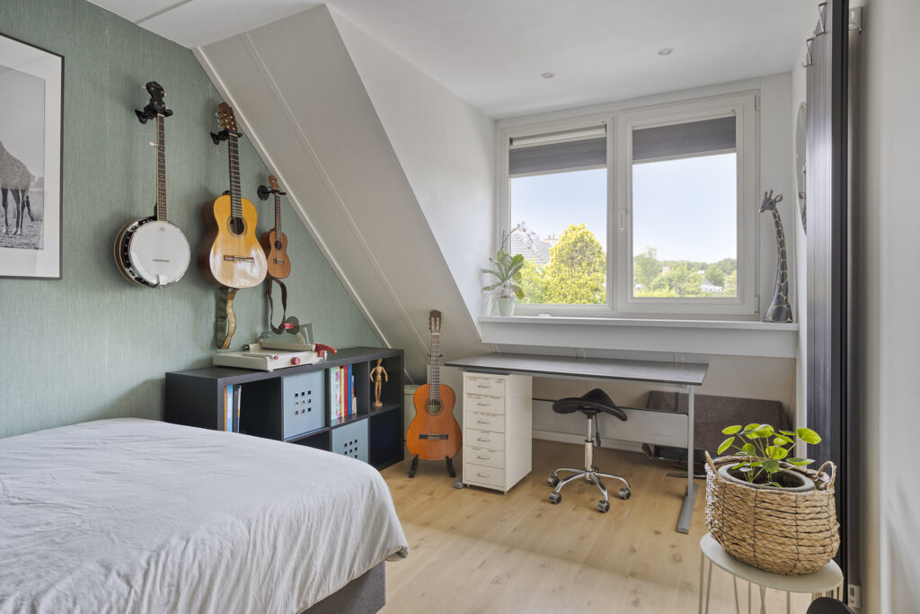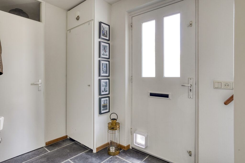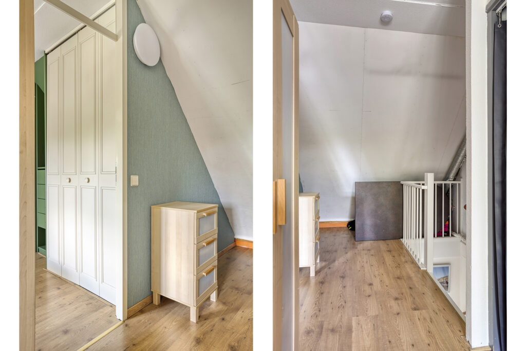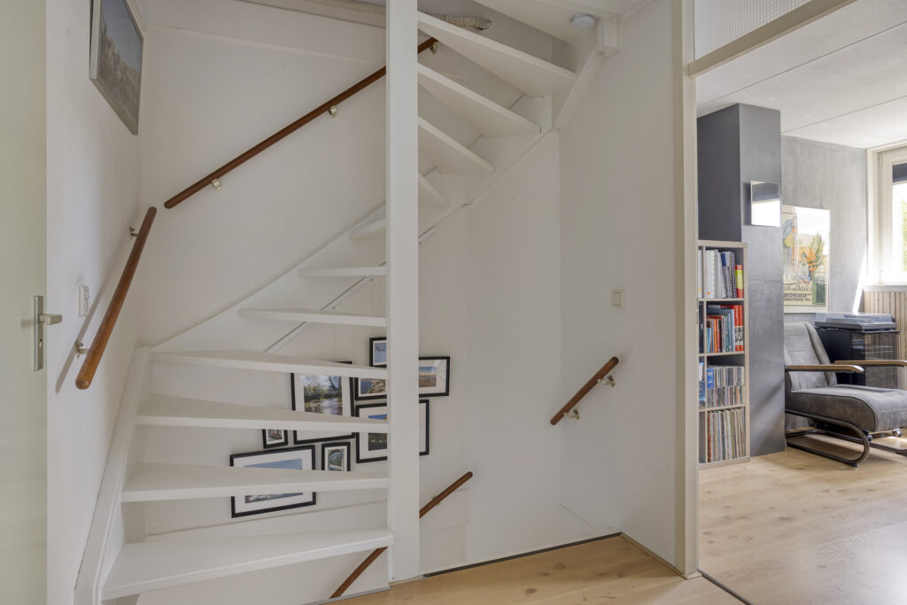 Overloop met toegang tot 3 slaapkamers, de badkamer en de trapopgang naar de tweede verdieping. De gehele verdieping (m.u.v. badkamer) is afgewerkt met een doorlopende laminaatvloer. Alle ramen op de eerste en tweede verdieping zijn voorzien van magnetische raambekleding.
