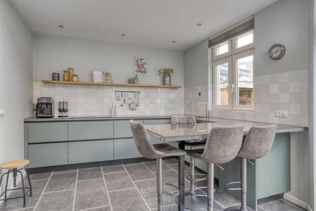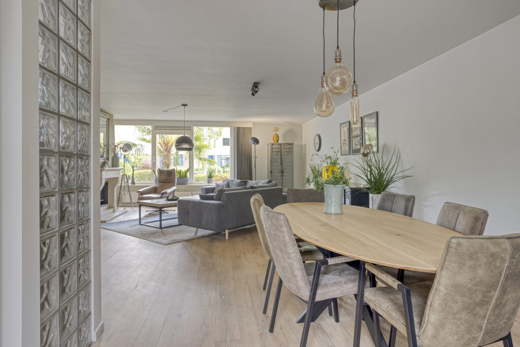 Entree met toegang tot de hal met trapopgang naar de eerste verdieping, de vernieuwde meterkast en de toiletruimte voorzien van een hangend closet met fonteintje. De royale woonkamer met sfeervolle open haard heeft door de grote raampartijen en de Solatube veel natuurlijk lichtinval. De moderne eetkeuken (2022) met lichtkoepel, bar en keukenwand is voorzien van een keukenblok hoekopstelling met composiet aanrechtblad en diverse onderkasten. Aan inbouwapparatuur is aanwezig: Bora inductie kookplaat met geïntegreerde afzuiging, koel/vries combinatie, vaatwasser, Quooker, magnetron en heteluchtoven. De raampartij is uitgevoerd met een handbediend zonnescreen en middels openslaande deuren is de tuin bereikbaar.